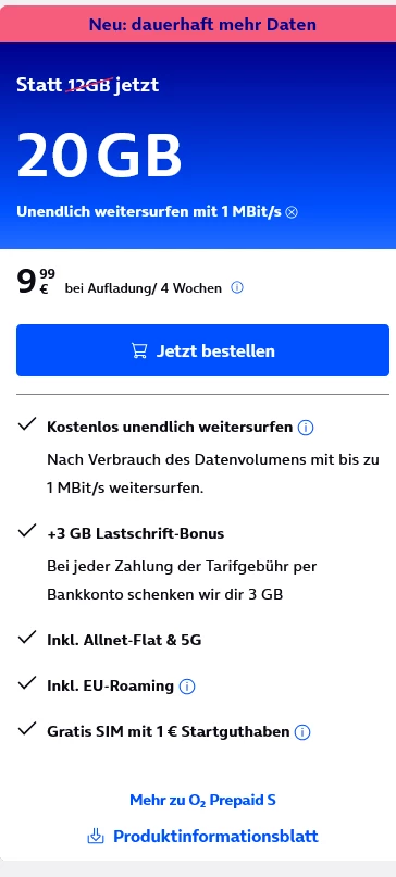 Da mir die 1 Woche jetzt auch egal ist, und die O² Seite gerade gut funktioniert bei mir, und Heute ja auch Dienstag ist, versuche ich jetzt mal “Tarifwechsel” auf das O² Prepaid S… gab es da nicht noch vor kurzem auch einen 7,99€-Tarif? So viel hat meiner bisher gekostet, aber dann versuche ich das mal gleich und vielen Dank für eure Antworten so weit…