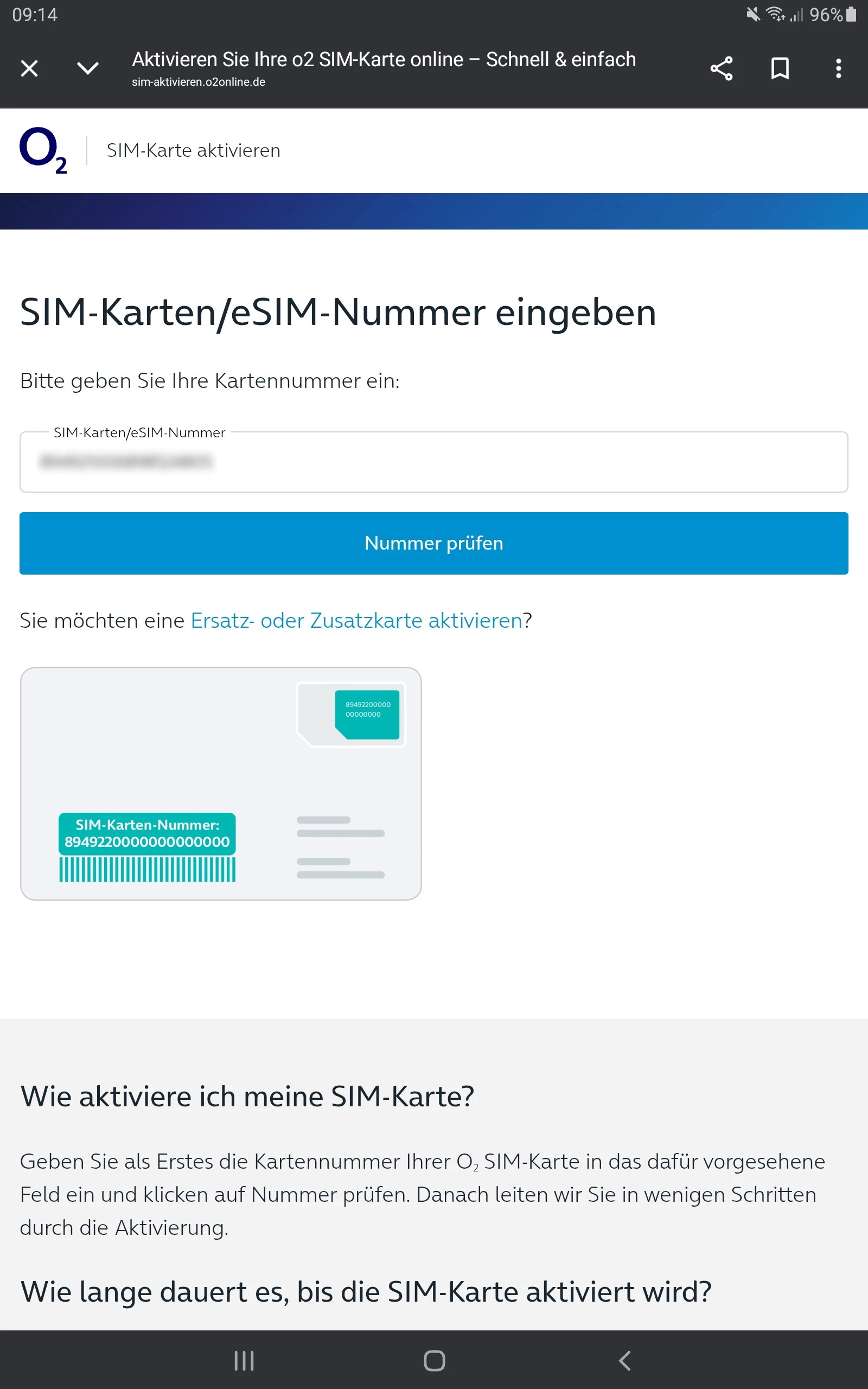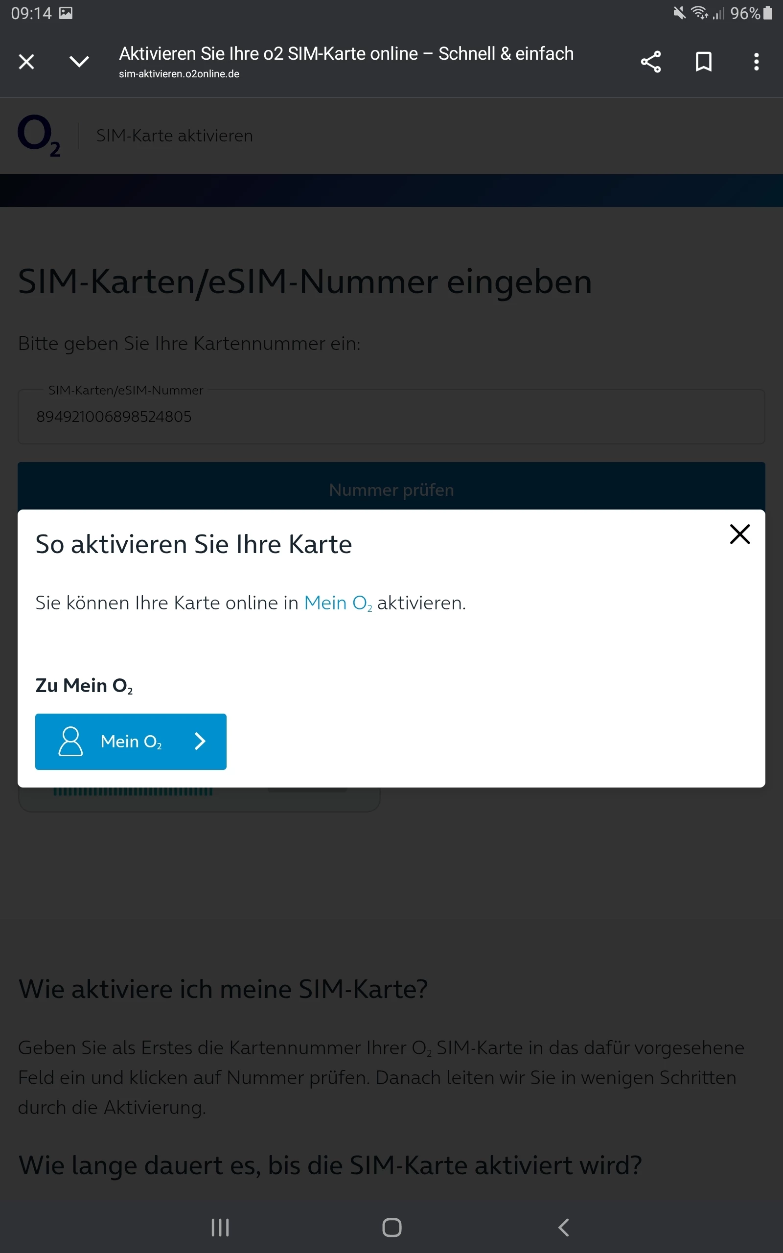 ich bin seit mehreren Jahren O2 Mobilfunkkunde Vertragskunde.  Meine Freundin aus dem Eu Ausland benötigt für 3-4 Monate eine Prepaidkarte. Daher habe ich für sie vor einigen Tagen eine O2 Prepaid S Simkart online auf meinen Namen  bestellt. Die Karte ist vor 4 Tagen angekommen. Nun versuche ich die Simkartennummer auf  o2.de/aktivieren zu aktivieren. Ich gebe die Simkartennummer ein und klicke auf überprüfen. Es kommt keine Identitätsprüfung. Dann öffnet sich ein kleines Fenster“So aktivieren Sie Ihre Karte Sie können Ihre Karte online in Mein O2 aktivieren.” . Da komme ich aber nicht weiter, da ich mich mit einer Rufnummer registrieren soll, welche noch überhaupt nicht erhalten habe. Ich habe es mit der Aktivierung auf verschiedenn Computern und Handys versucht. Auch mit einem Igoknito Fenster in Google Chrome die Aktivierung zu starten, nichts hat bisher funktioniert. Andere Browser wie Microsoft Edge und Firefox funktionieren auch nicht. Mehrer Anrufe bei der Hotline brachten auch kein Ergebnis. Kann mir da jemand weiterhelfen? Was mache ich falsch? Wo liegt der Fehler? Auch im O2 Shop will man mir nicht weiterhelfen, da dort nur die im Shop gekauften Simkarten aktiviert werden, und das kostet 20 Euro extra.