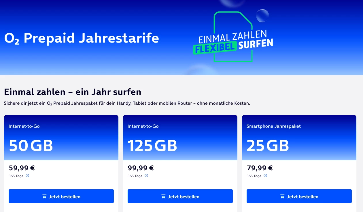 O2 bietet prepaid Jahrespacks an,