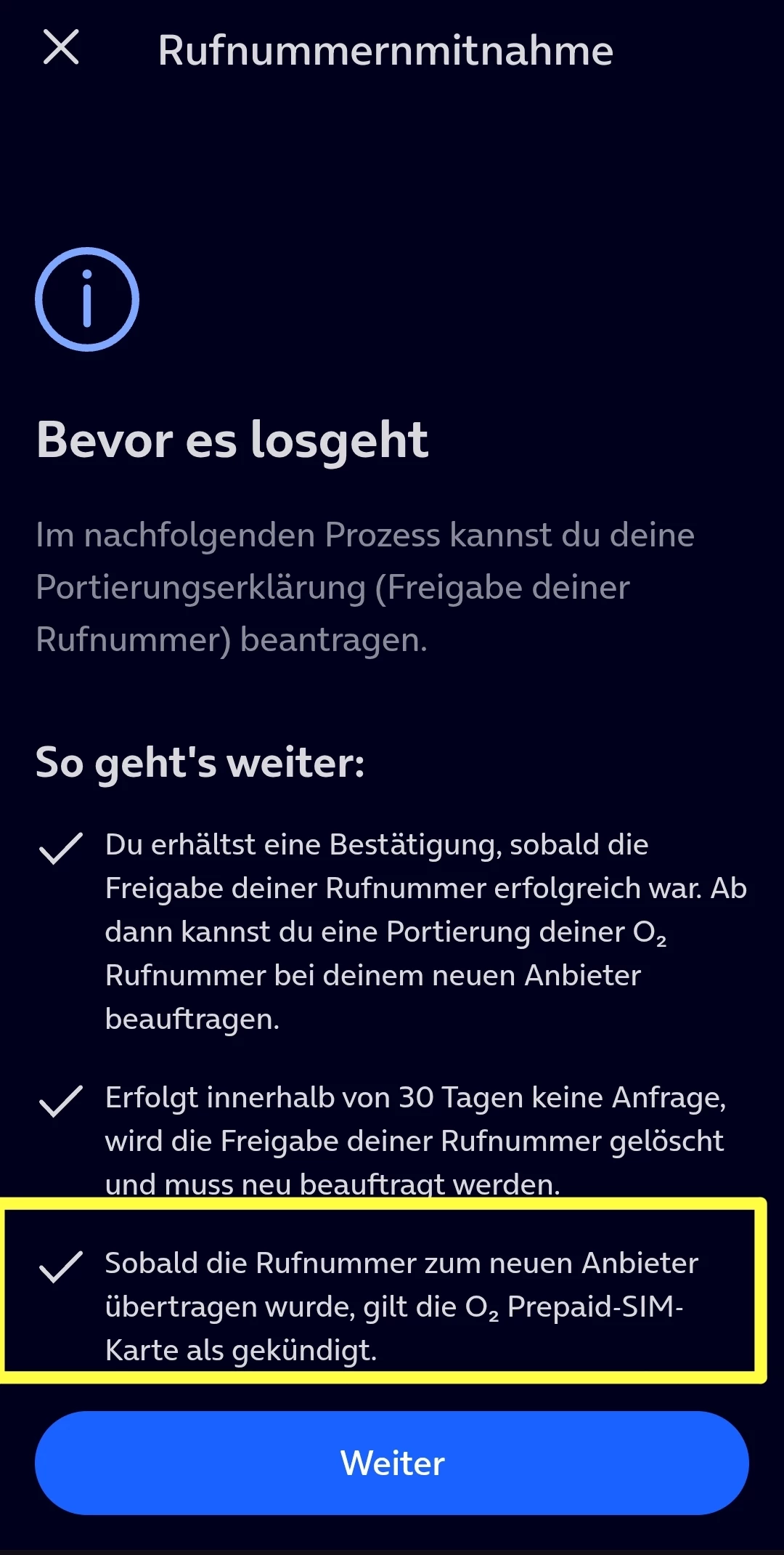 Wenn ich jetzt die Freigabe zur Portierung der Rufnummer meiner Prepaid-SIM anstoßen würde, steht gleich zu Beginn das