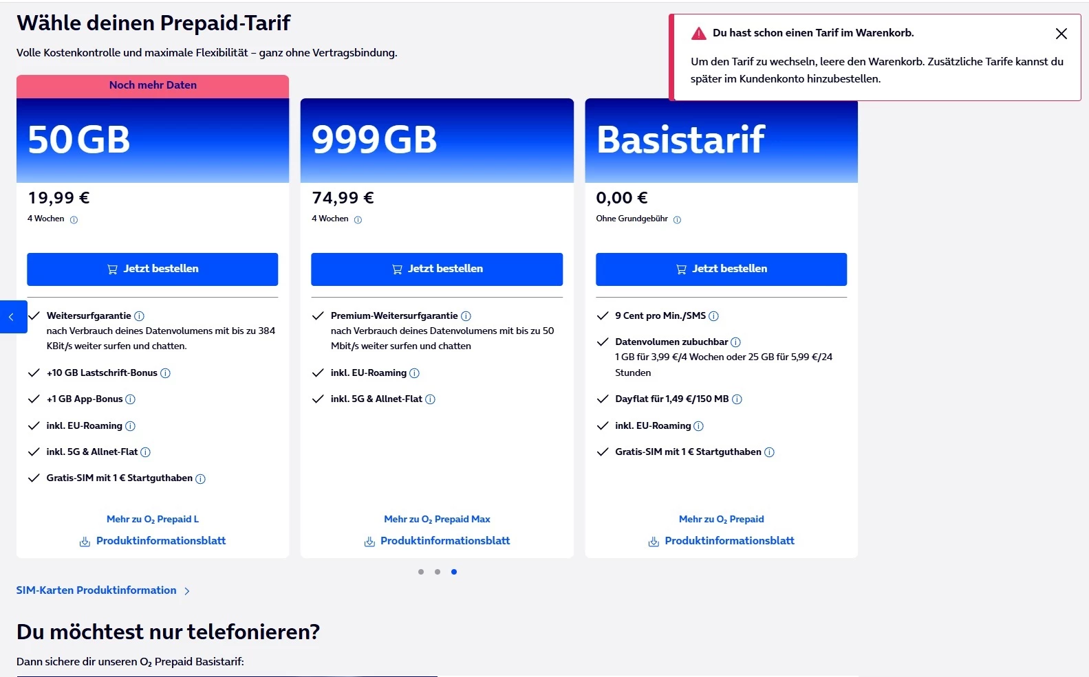 ich habe exakt das gleiche Problem wie ​@Crumar. Ich habe auch eine Freikarte bestellt. Jetzt wird im Registrierungsprozess O2 Prepaid L 50 GB für 19,99 EUR als “Mein Tarif” angezeigt. Etwas anderes kann ich nicht auswählen.