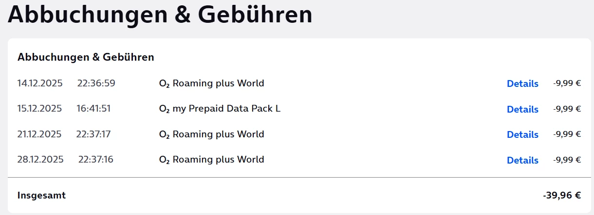 Ich habe zusätzlich einen Screenshot der Abrechnung beigefügt, der zeigt, dass Roaming Plus World automatisch dreimal verlängert und jeweils mit 9,99 € berechnet wurde (insgesamt 29,97 €), obwohl in der Mein-O₂-App keine automatische Verlängerung angegeben ist
