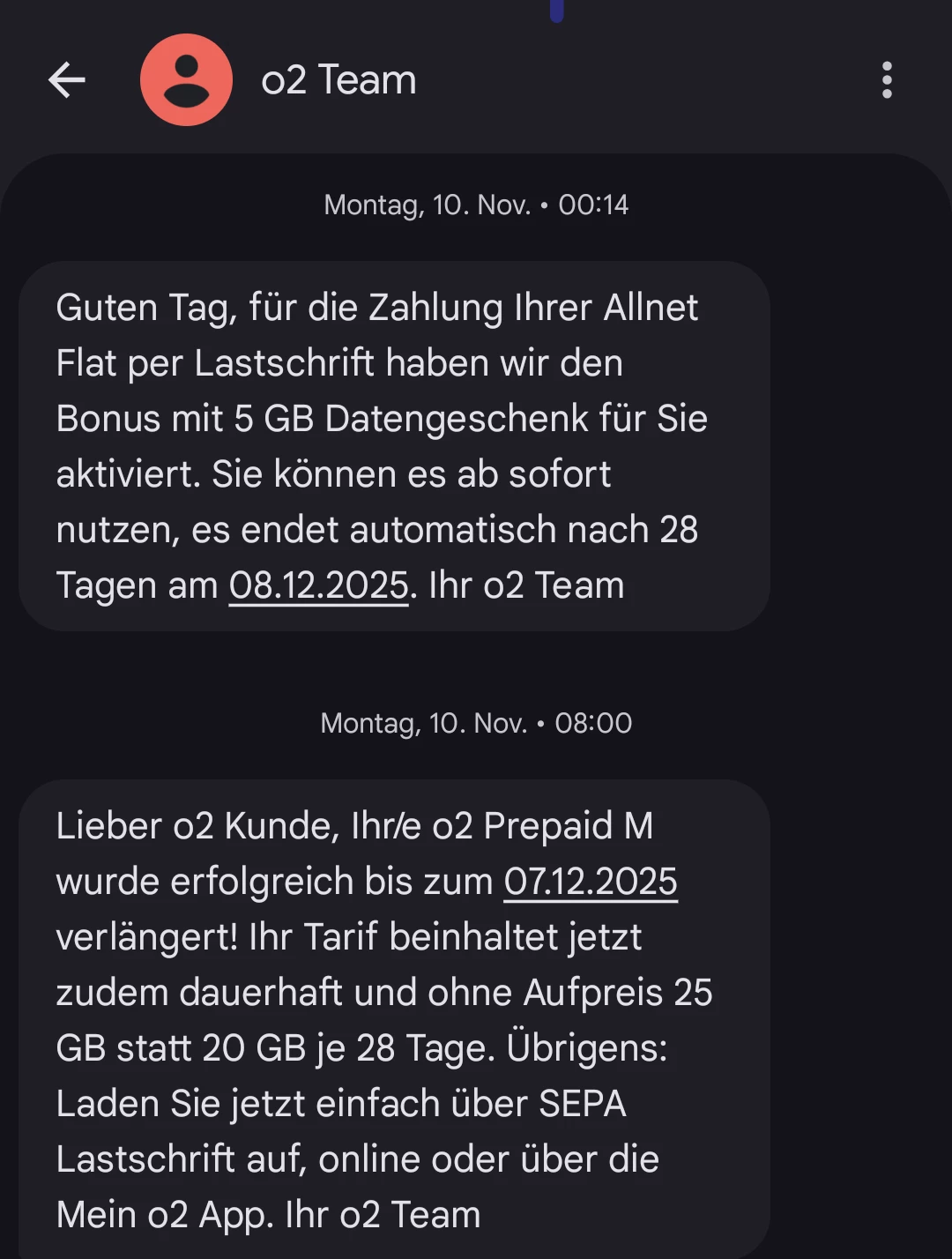 ich habe heute die sms bekommen, „deine o2 freisms endet in den nächsten zwei tagen…“. das hat mich verwundert da ich eigentlich den Prepaid M Tarif hab seit Jahren. Daraufhin hab ich auf der webseite als auch in der App nachgesehen und sehe neben dem Lastschriftbonus nun „10 von 10 frei sms“ anstatt meine 25GB aus dem prepaid M Tarif. der Prepaid M Tarif sollte aber noch bis zum 7.12 aktiv sein.