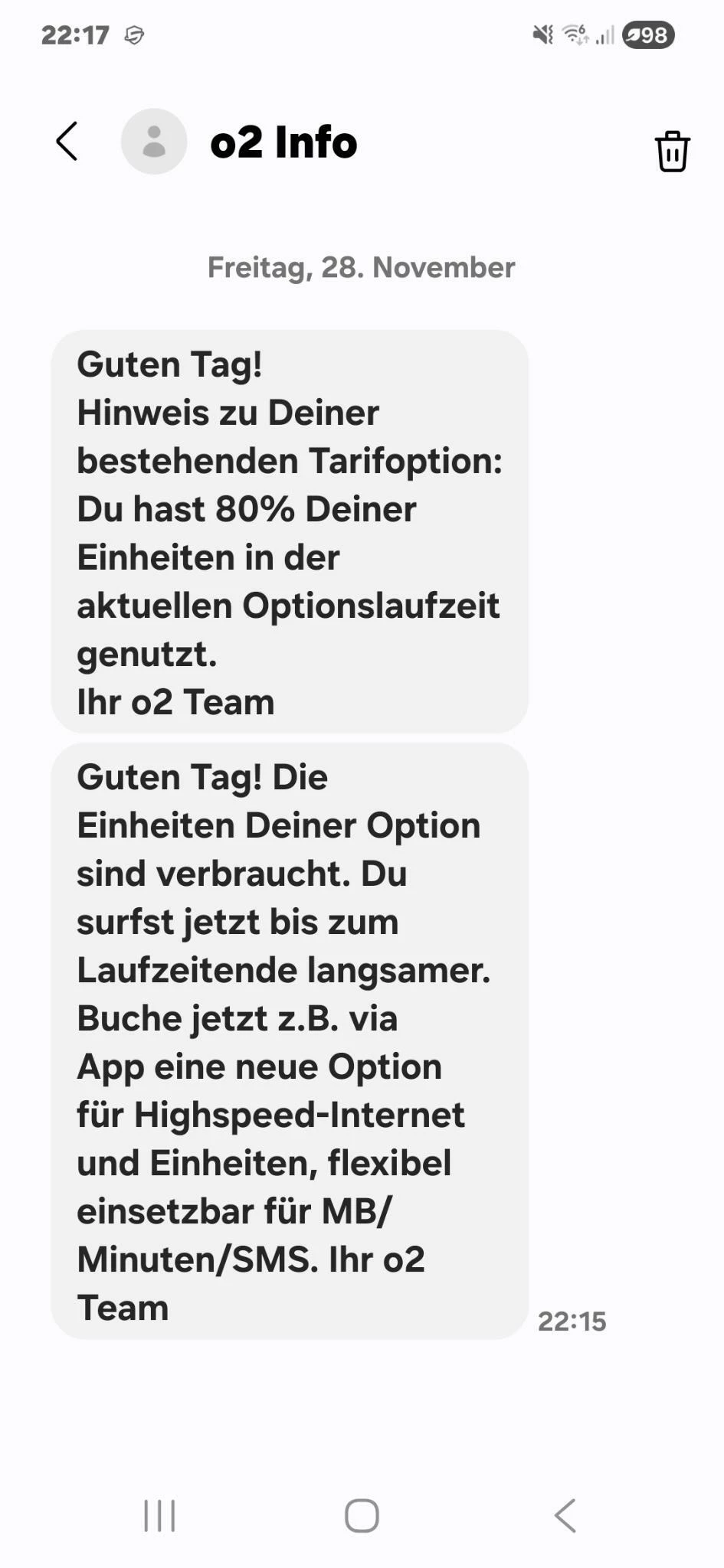 Hallo ​@Tirol65, schön, dass du dich hier meldest.🙂 Das ist eine Drossel-SMS, die du einmal nach Verbrauch von 80% des Highspeed Daten Volumens bekommst und einmal nach komplettem Verbrauch.