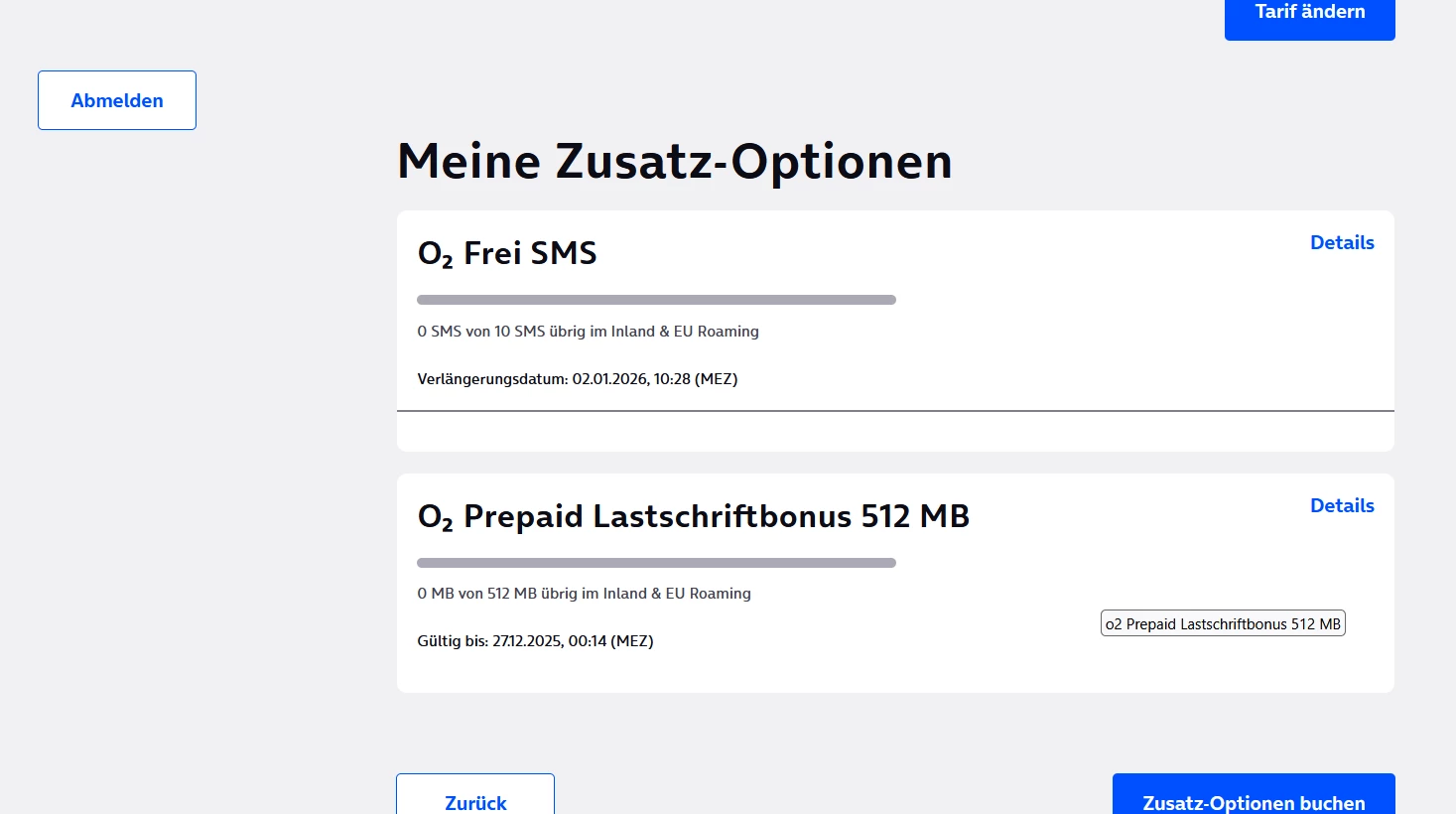 ich habe heute die sms bekommen, „deine o2 freisms endet in den nächsten zwei tagen…“. das hat mich verwundert da ich eigentlich den Prepaid M Tarif hab seit Jahren. Daraufhin hab ich auf der webseite als auch in der App nachgesehen und sehe neben dem Lastschriftbonus nun „10 von 10 frei sms“ anstatt meine 25GB aus dem prepaid M Tarif. der Prepaid M Tarif sollte aber noch bis zum 7.12 aktiv sein.