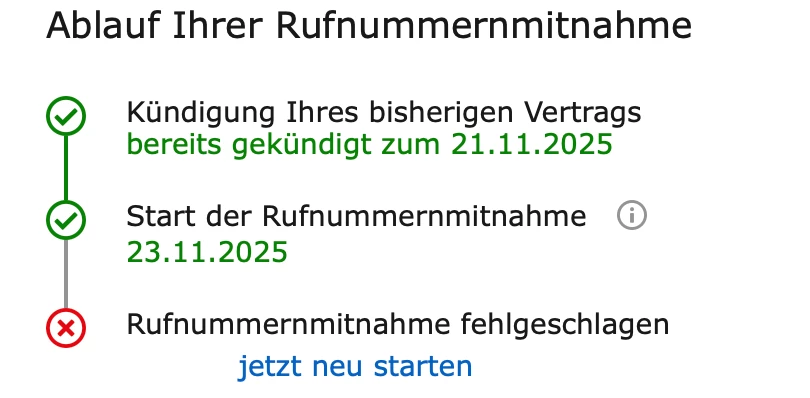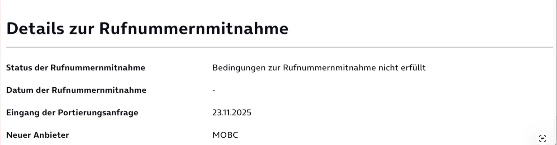 Es war eine Sofort-Portierung. Siehe Screenshot: ‘Start der Rufnummernmitnahme 23.11.2025’ und ‘bereits gekündigt zum 21.11.2025’. Trotzdem wurde sie abgelehnt.