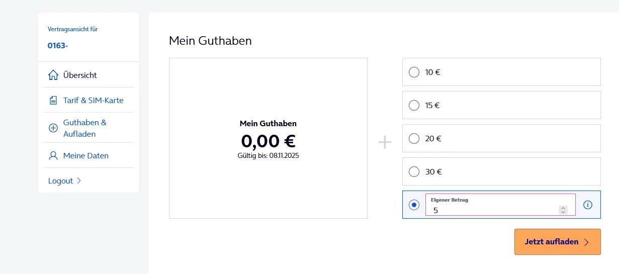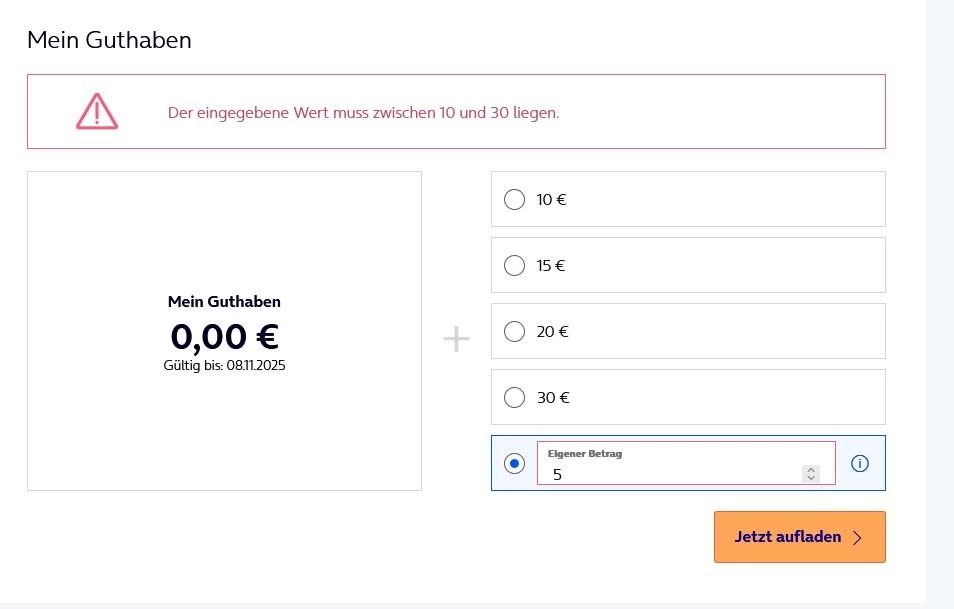 Account war ein Guthaben von  0 Euro  eingetragen , das noch bis zum  8.11.2025 gültig