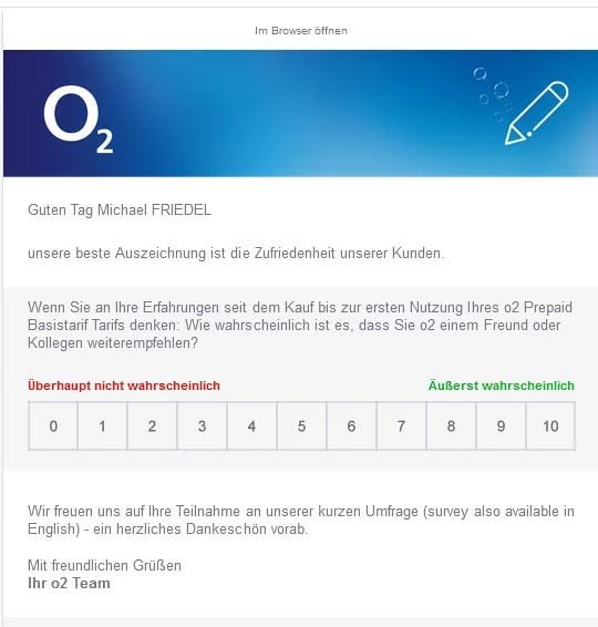 vom o2 Team . Von einer Kundenbetreurin die R .  Bo**** heißt . Das ist die Antwort aus dem