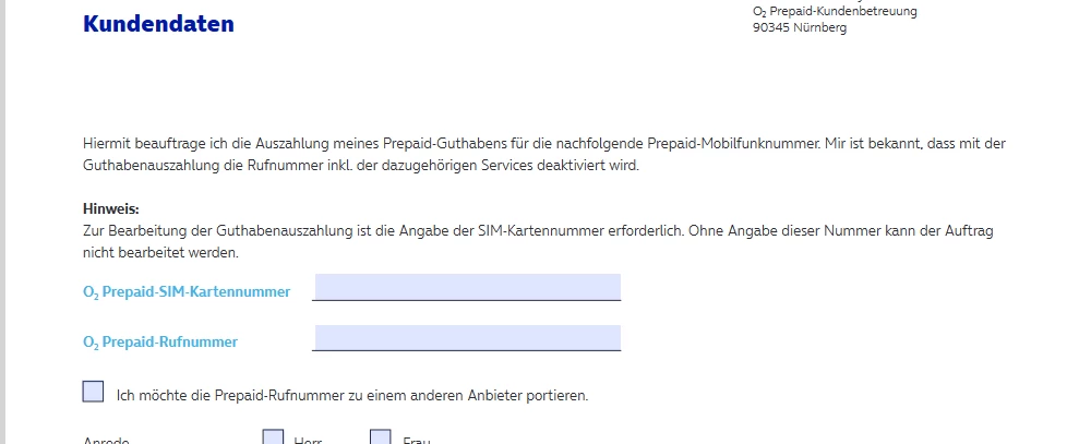 "Hiermit beauftrage ich die Auszahlung meines Prepaid-Guthabens für die nachfolgende Prepaid