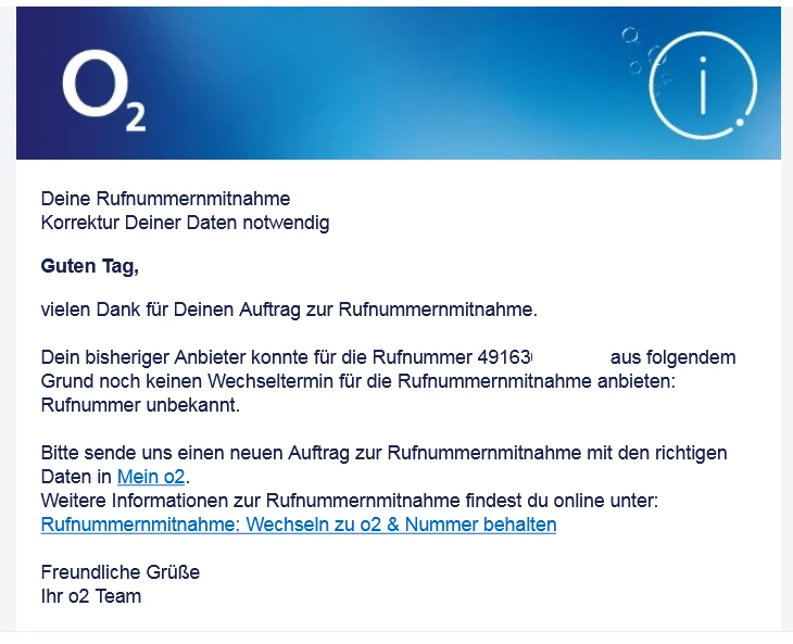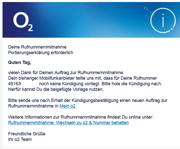 Nach meinen ersten Antrag die Rufnummer zu übertragen bekam ich Ende August diese Antwort :