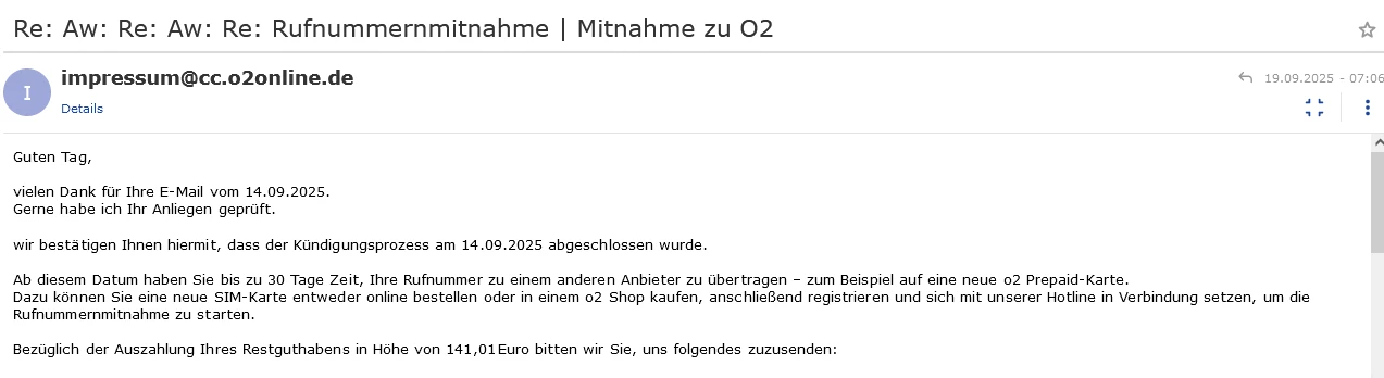 Die Antwort vom o2 Team kam auch am 27.8. mit dem Hinweis “ dass für Deine Rufnummer 49163 **** “ noch keine Kündigung vorliegt.