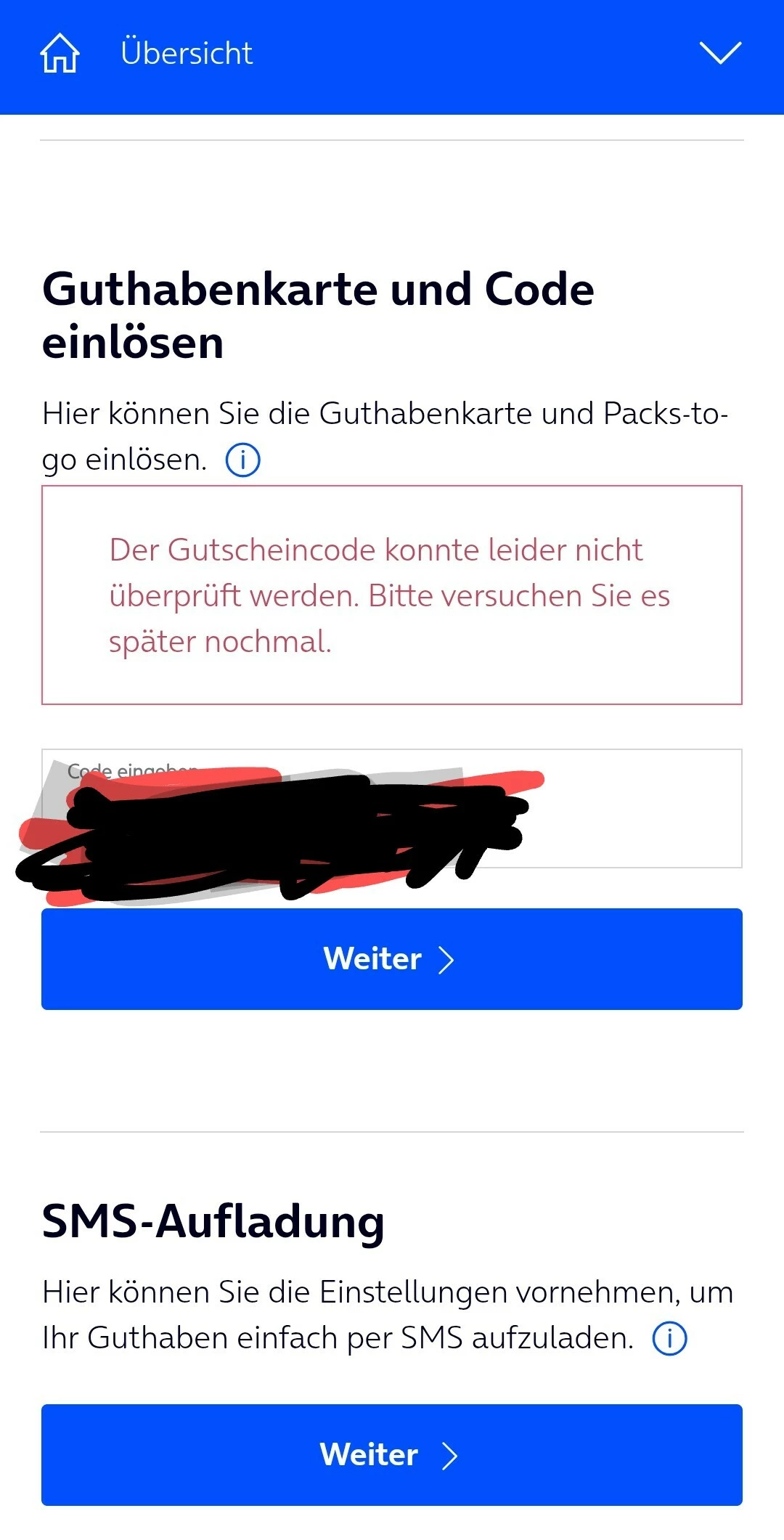 Schade, dass es bei dir mit deinem Aufladecode nicht geklappt hat und du eine Fehlermeldung bekommen hast 🤔 Konntest du dich gestern bei uns im Chat melden? Konnte man dir dort weiterhelfen?