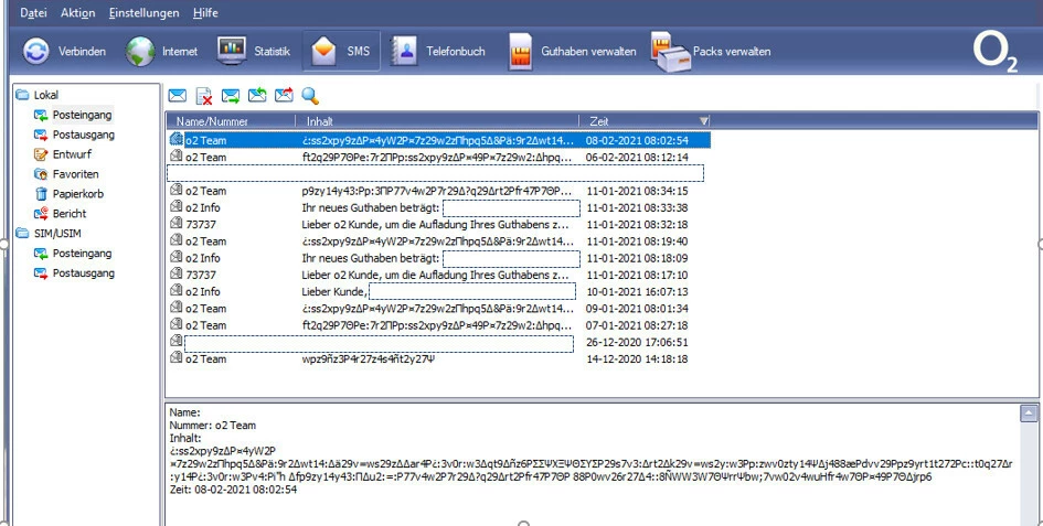 seit ich meinen O2 Surfstick besitze, bekomme ich von “O2 Team” immer wieder sowohl leserliche, aber auch völlig unleserliche SMS Nachrichten, die nur aus Sonderzeichen bestehen -- und zwar auf zwei verschiedenen Computern mit verschiedenen Windows-Versionen. Bisher “hat man nichts finden können” -- und auch bei Recherchen im Internet habem nichts dazu ergeben.  Es handelt sich also vermutlich um einen sehr seltenen Einzelfall? Auch dann sollte dies ja interessant sein!   Jedenfalls geht es mir allmählich ziemlich auf die Nerven!