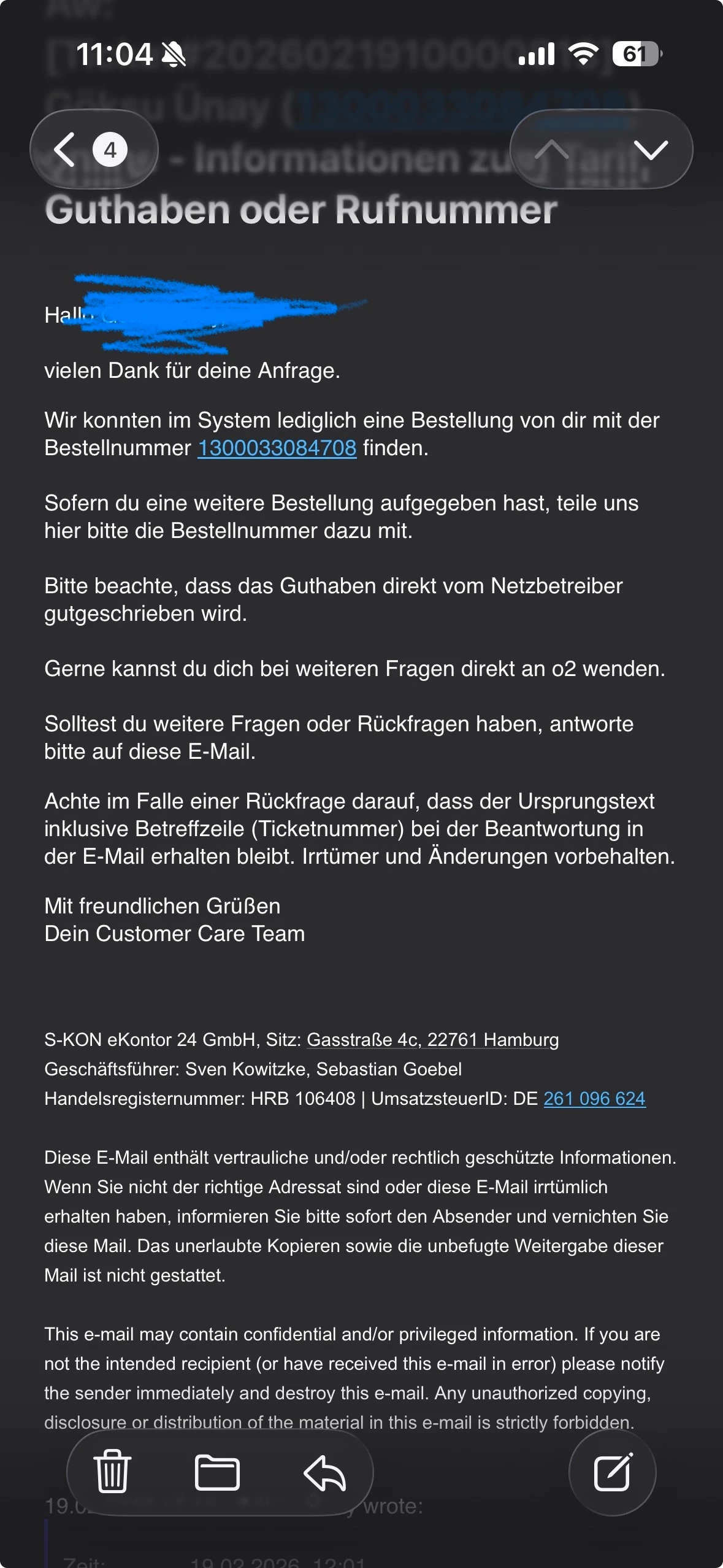 außerdem hatte ich eine Sim Karte bestellt, weil ich nir eine physische bekommen hatte. Am Telefon wurde mir auf Nachfrage erst gesagt das es was kostet, weil ich keine Anschlussgebühr bezahlt hätte. Nachdem ich aber erklärte das mir sehr wohl eine Anschlussgebühr abgebucht wurde sagte die Mitarbeiterin, dass es kostenlos wird. Daraufhin habe ich bestellt. Dann wurden mir 29,99€ dafür abgebucht.
