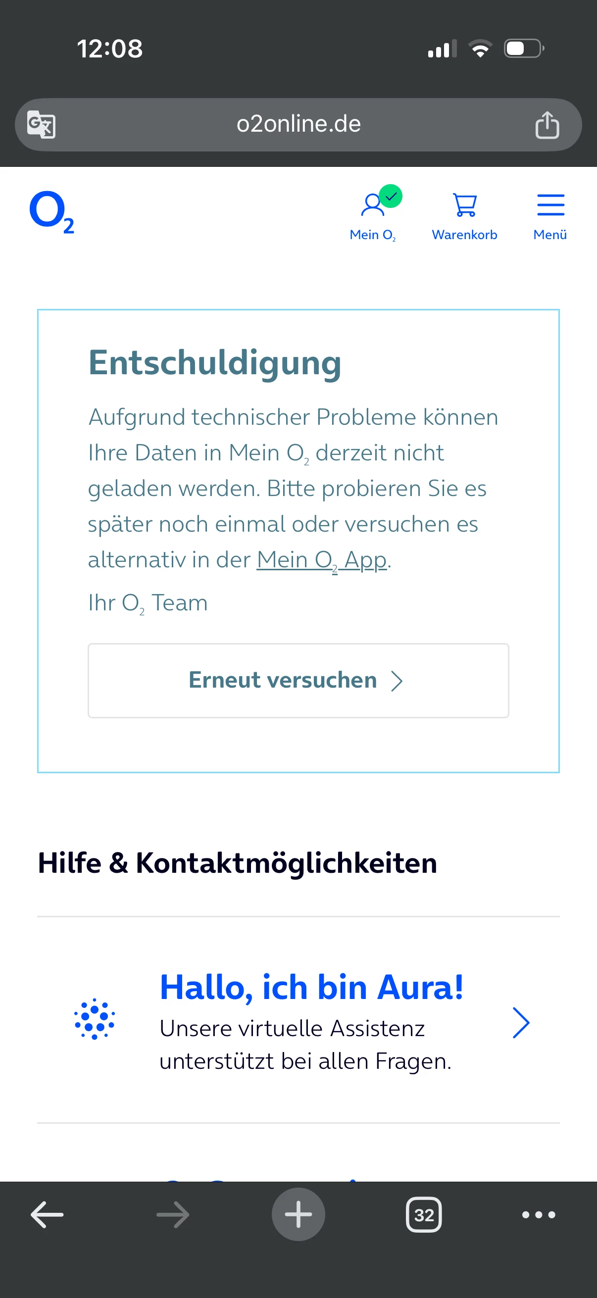 Und drittens, seit drei Tagen versuche ich, auf die O2-Seite bzw. den Bereich „Mein O2“ zuzugreifen, um den QR-Code zu finden. Aber jedes Mal, wenn ich es versuche, erscheint eine Fehlermeldung über technische Probleme, und ich kann nicht zugreifen.