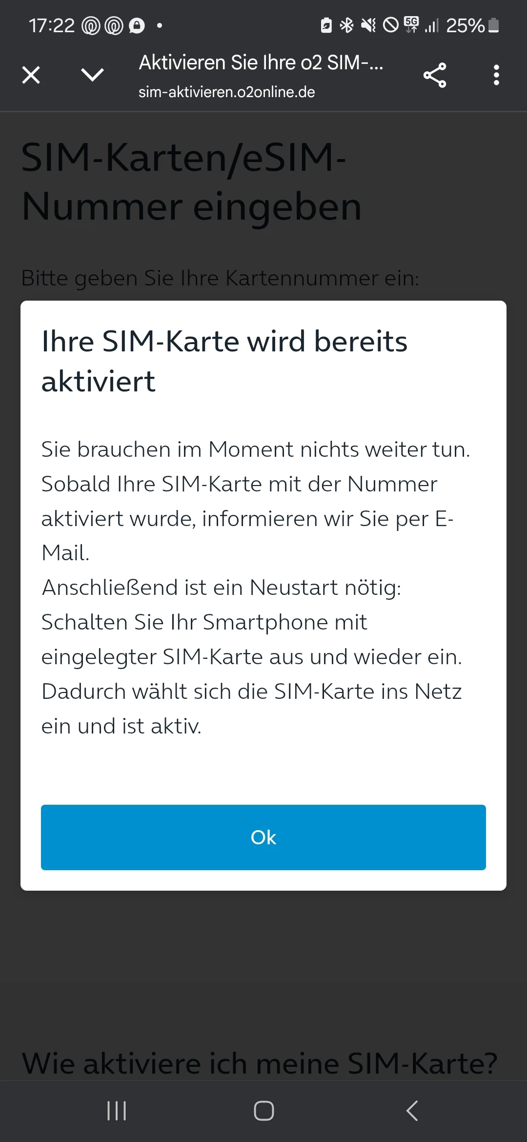 Jedes mal wenn ich mein Telefon neustarte, ist sie immer noch nicht aktiviert, obwohl der O2 Support mir versicherte, dass so etwas höchstens 2 Tage dauert. Weiß jemand weiter?