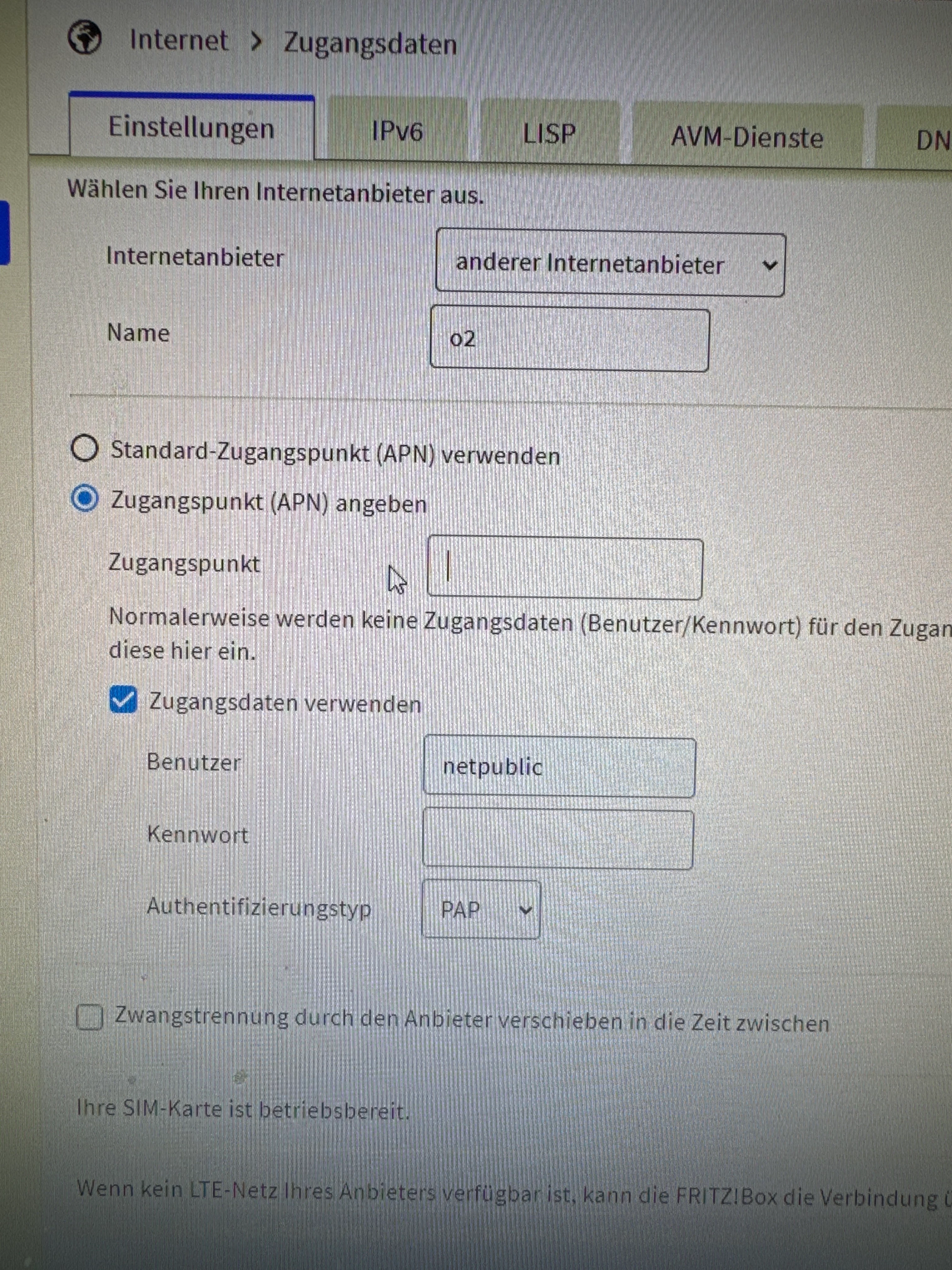 O2 gibt es bei mir als Anbierter aber da kann ich die APN nicht ändern, wenn ich jetzt auf anderer Anbieter klicke und in den Freitext O2 eingebe, muss ich einen Zugangspunkt angeben, den kenne ich jedoch nicht