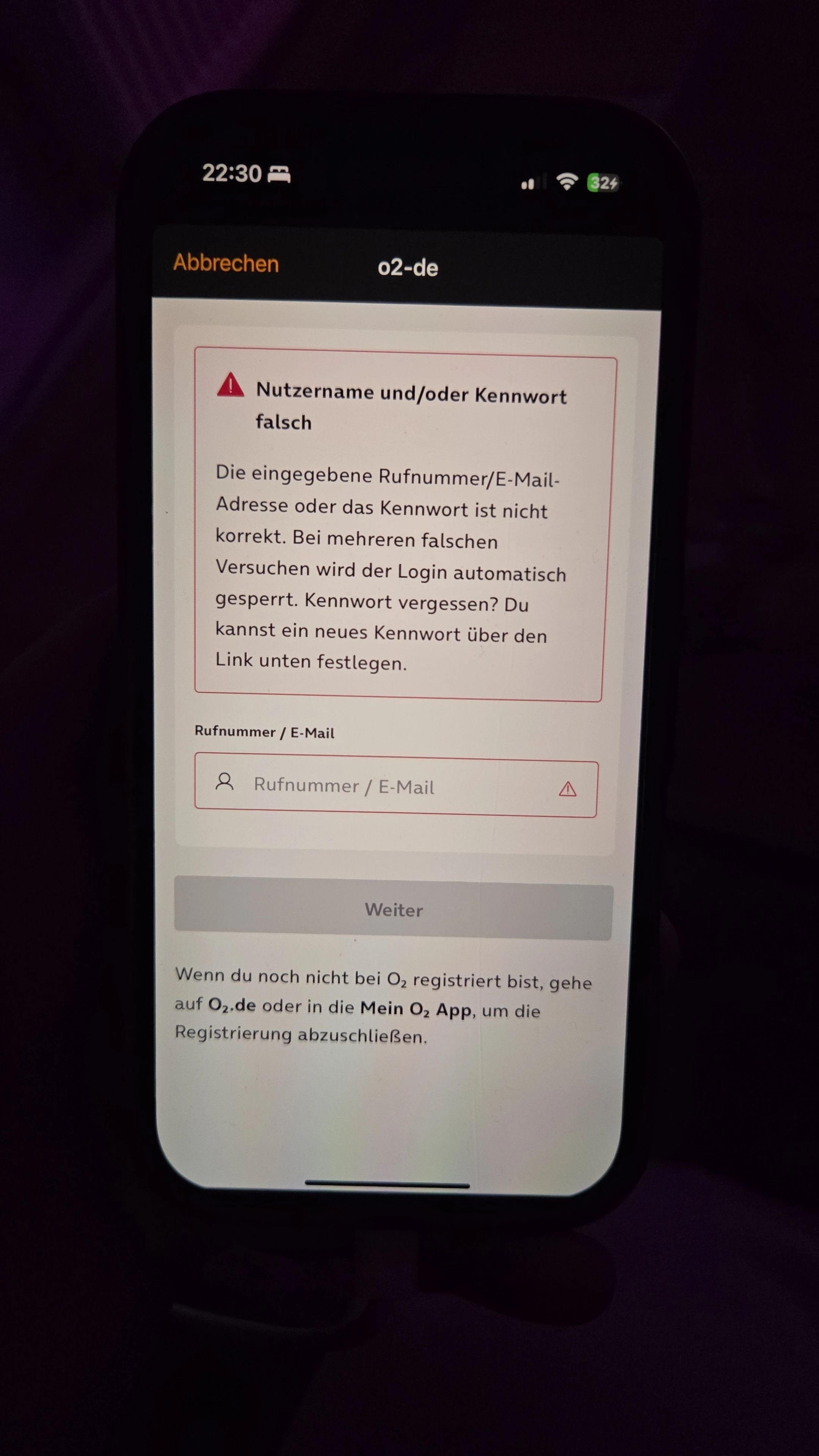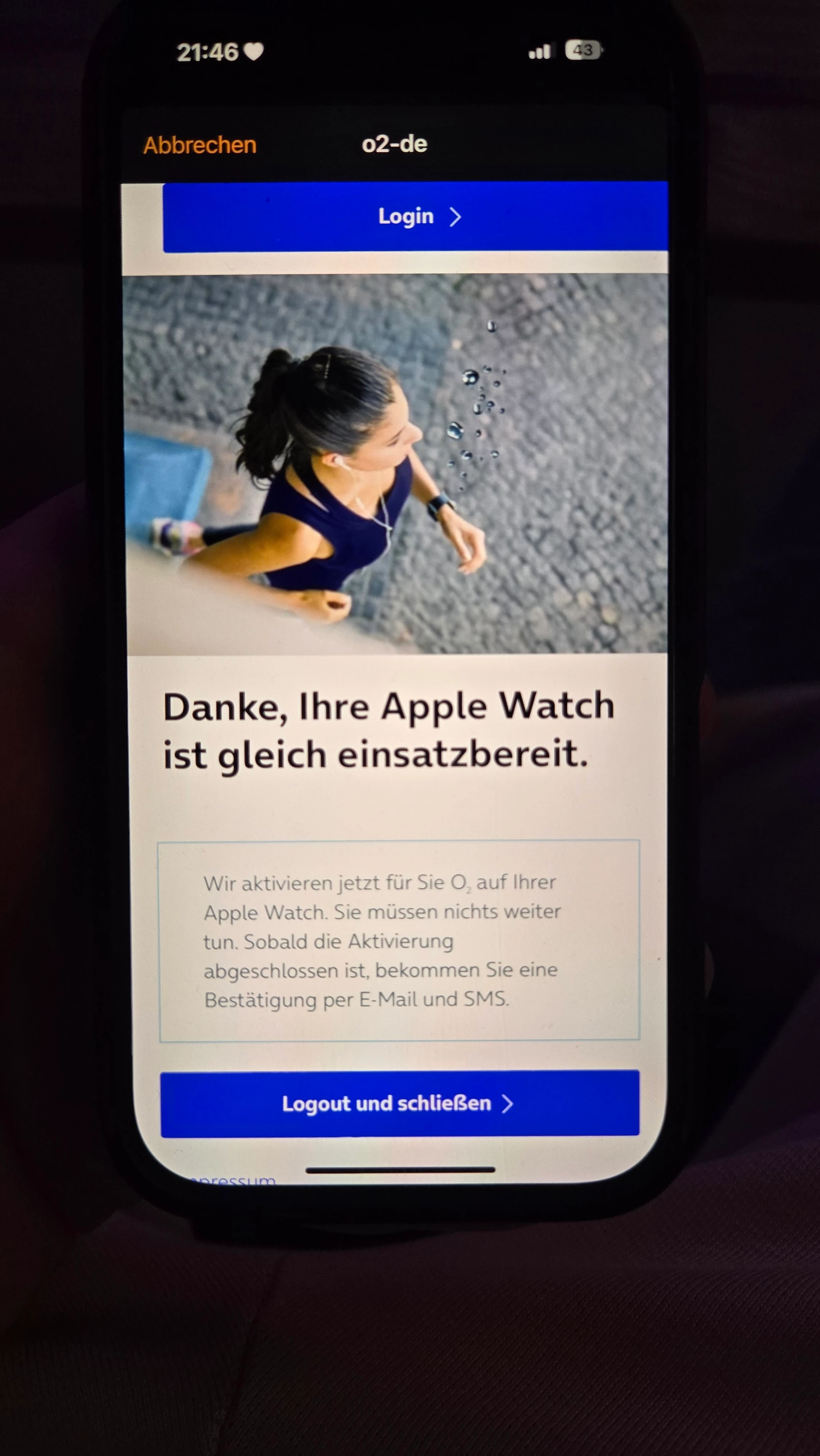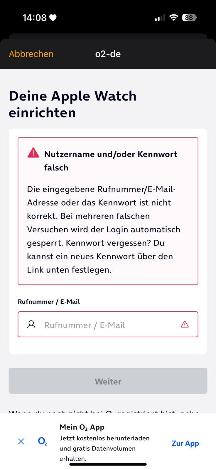 Bei der Registrierung nachdem die abgeschlossen war konnte ich mich in der mein o2 app nicht anmelden aufgrund von einem falschen passwort. Nachdem ich auf passwort zurücksetzen geklickt habe wurde ich erfolgreich eingeloggt in der mein o2 app. Wenn ich jedoch über die watch app versuche Mobilfunk einzurichten kommt die Meldung wie in den Bildern zu sehen.