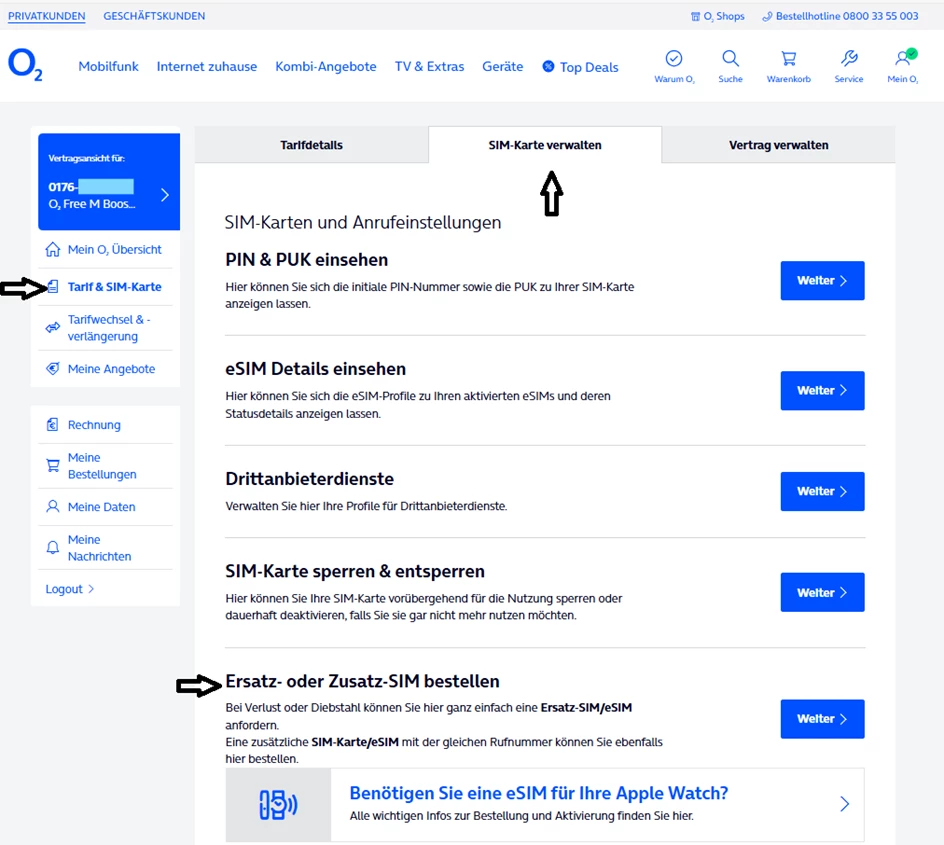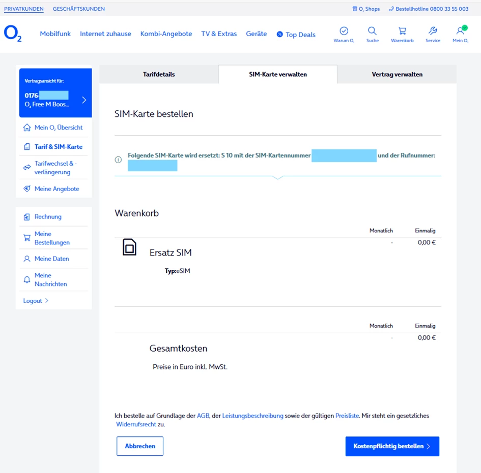 geht ihr auf der linken Seite auf Tarif & SIM-Karte, wählt den Reiter SIM-Karte verwalten und scrollt dann ein wenig runter auf Ersatz- oder Zusatz-SIM bestellen: