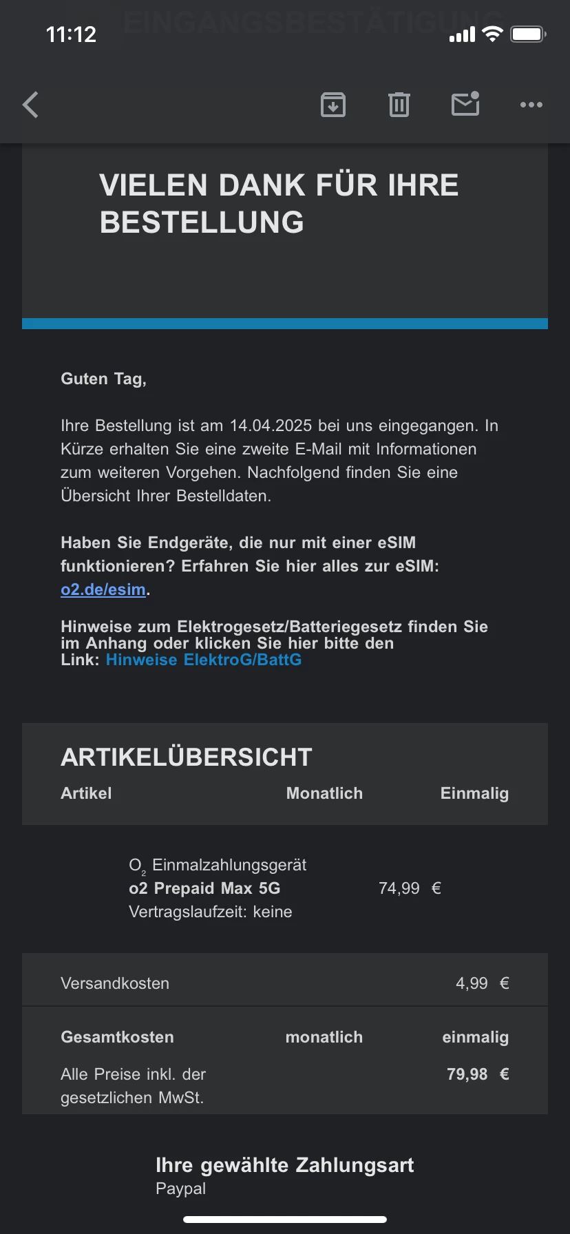 Ich habe über die Website eine Prepaid-Max-SIM-Karte für 74,99 + Versandkosten bestellt. Bei der Bestellung habe ich als Zahlungsart PayPal ausgewählt. In meinem Konto wird diese Zahlung als ausstehend angezeigt. Ich habe diese E-Mail nach der Bestellung der Karte erhalten.