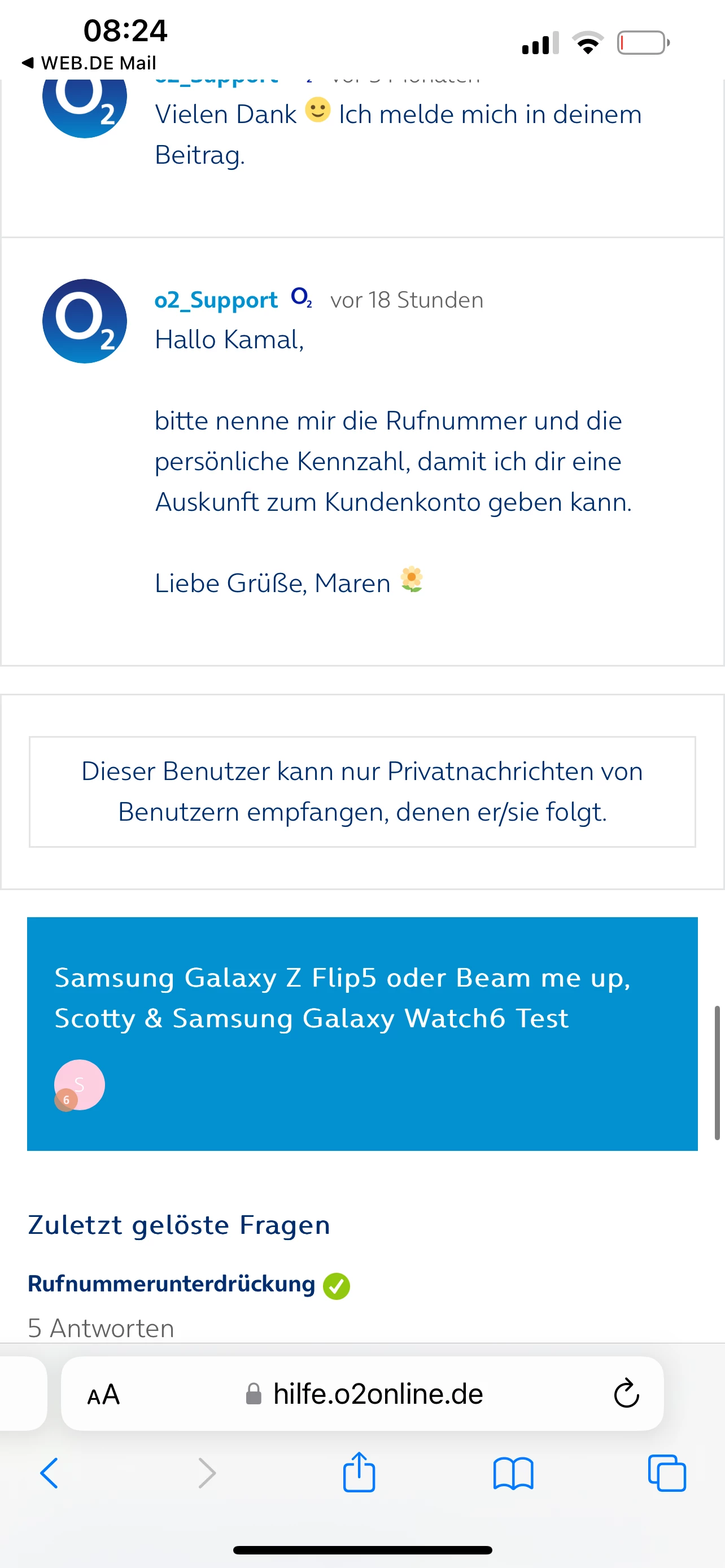 ich habe dir eine private Nachricht von o2_Support geschrieben. Bitte antworte mir dort und melde dich hier im Thread, sobald du mir geantwortet hast.