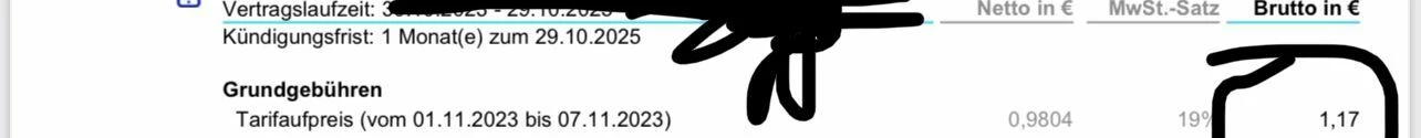 die 1,17 Euro sind ja wegen einer Tarifaufpreis laut Rechnung von den zwei Rufnummern welche storniert wurden entstanden….
