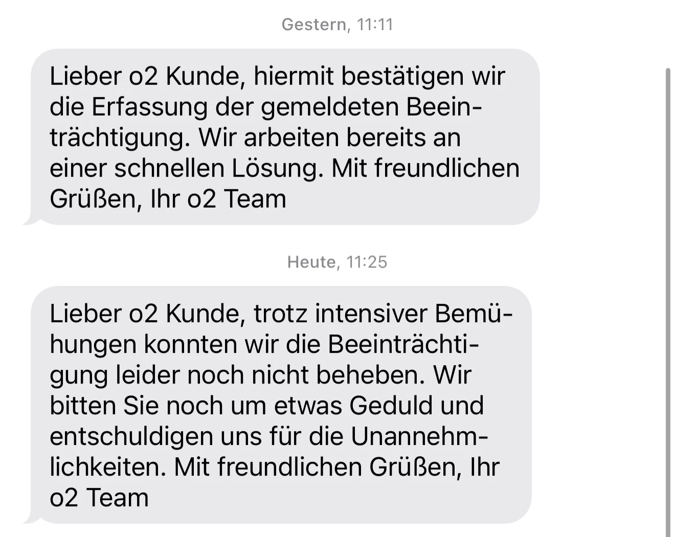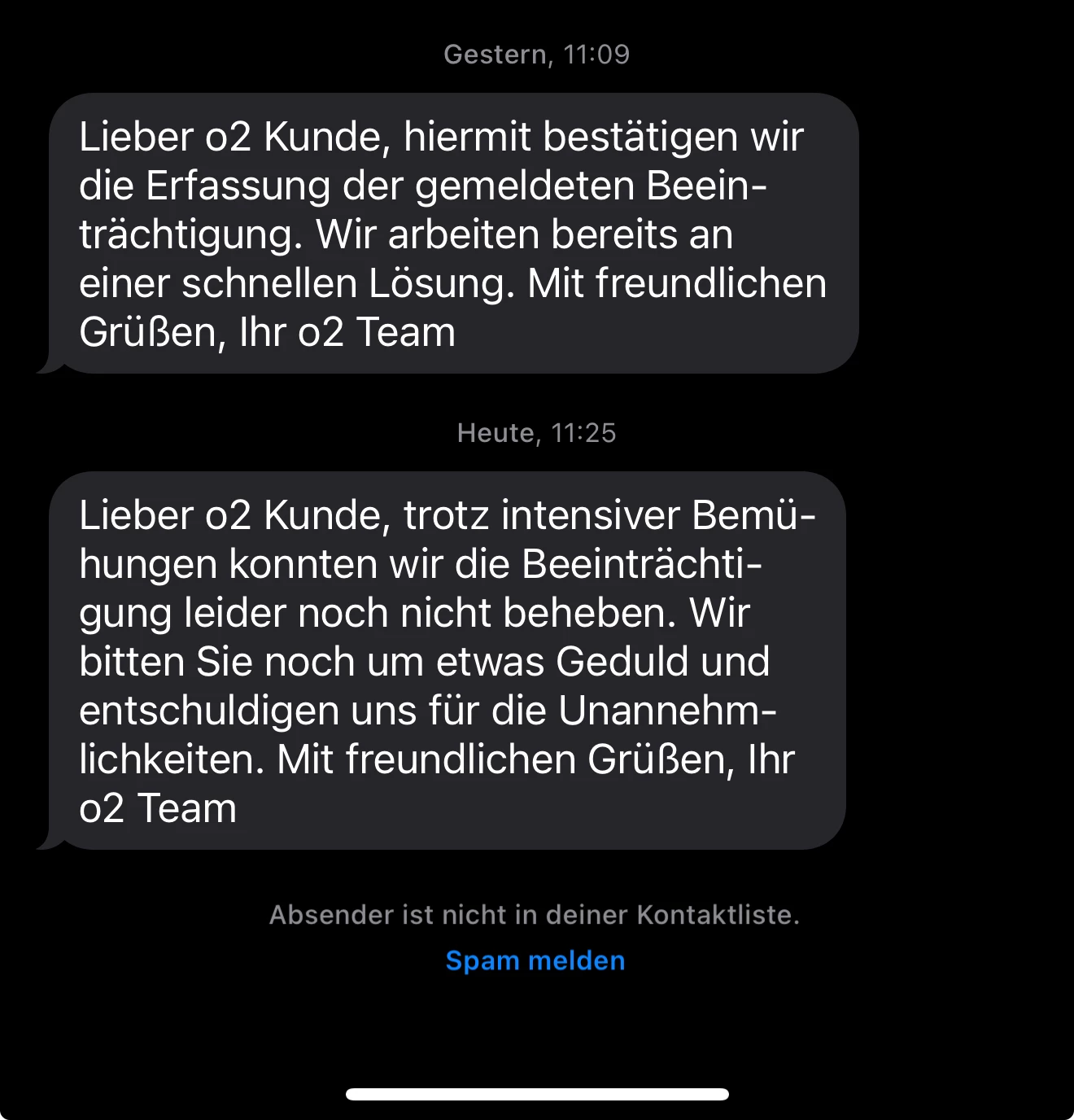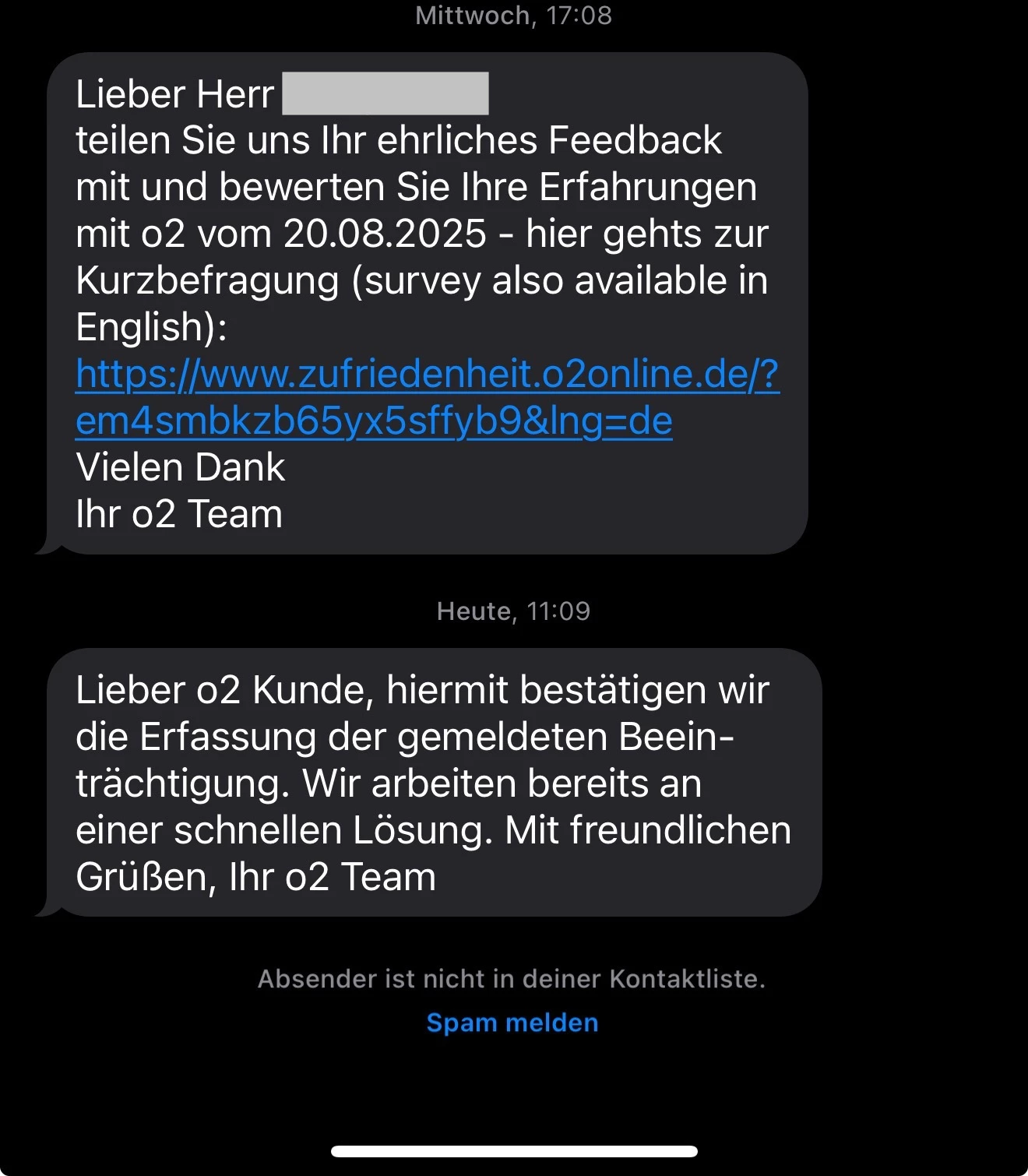 Und wenn ich O2 wäre, würde ich eine „Ehrliches Feedback“ SMS erst NACH Behebung der Fehler versenden.