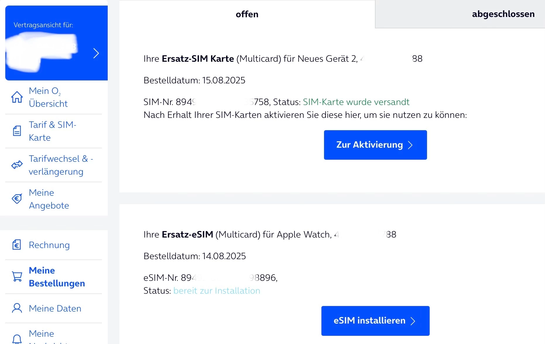 @o2_Rebecca, könntet ihr bitte alle offenen auf nachfolgendem Screenshot gezeigten Aufträge entfernen (lassen). Und ja, teilweise „seht“ ihr sie wohl nicht im System. Aber sie sind da: sie werden ja in meinem Datensatz aufgelistet…und viel schlimmer: sie verhindern mutmaßlich das Provisioning non-korrupter eSIM-Profile.
