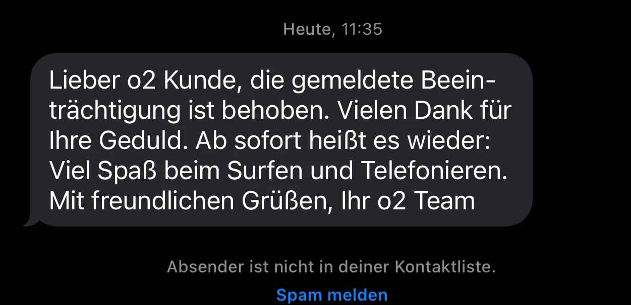 Ich hoffe nur das mit der SMS zur Beeinträchtigungs Beseitigung, das Ticket nicht geschlossen wurde.