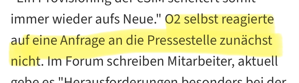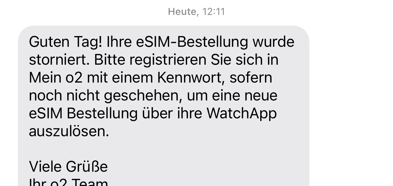 Das erweitert das Problem auf das GESAMTE eSIM-System von o2 und nicht nur die Apple Watch und ist mein ganz persönlicher Alptraum. Wenn ihr nicht in der Lage seid verlässlich eSIMs auszustellen, ist das unternehmenskritisch. Und ganz ehrlich - der iPhone 17 Release wird diesen Laden hier sprengen und die Presse Telefonica den Arsch aufreissen, wenn ihr das nicht endlich in den Griff bekommt.