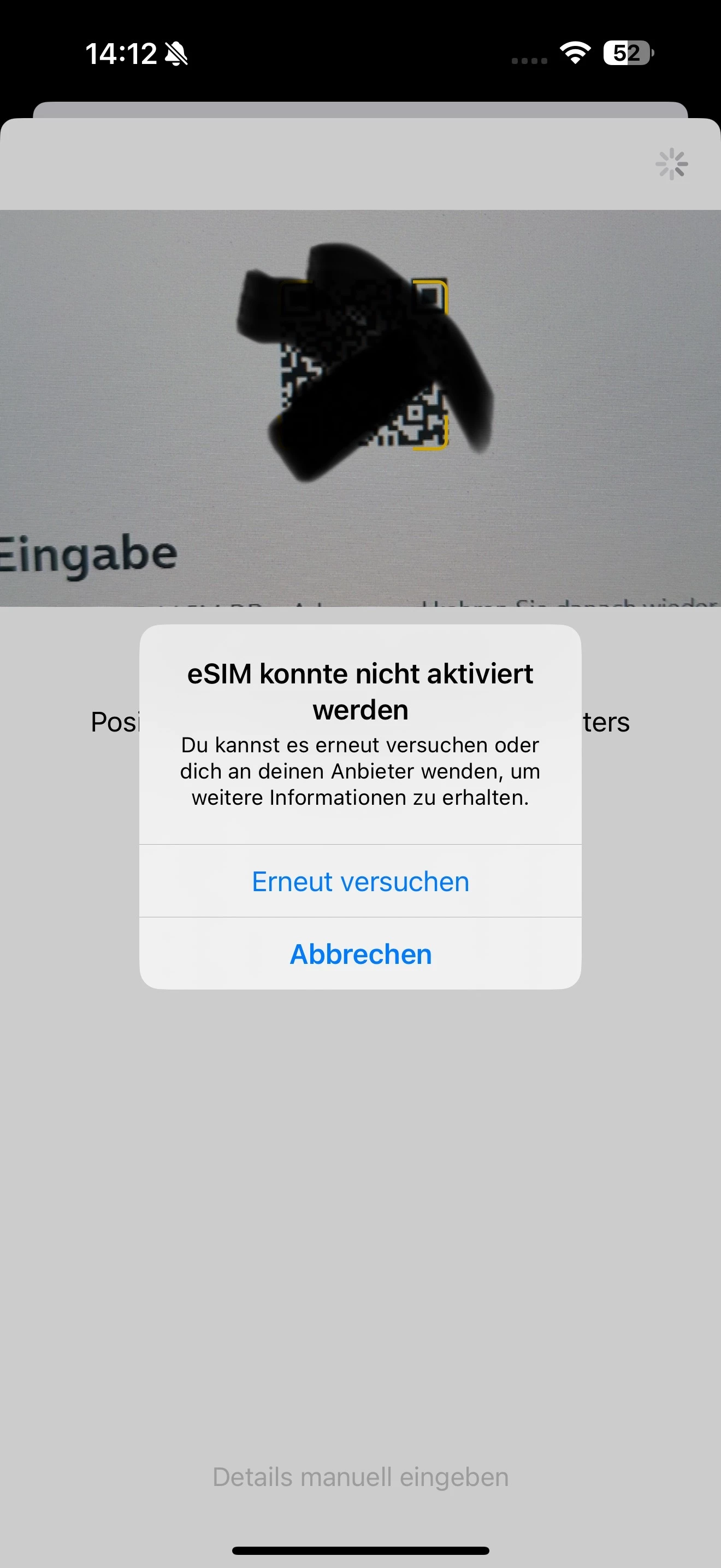 Die soeben bestellte Ersatz eSIM für das iPhone lässt sich nicht hinzufügen. Somit wäre mein Smartphone nun auch nicht mehr nutzbar…..