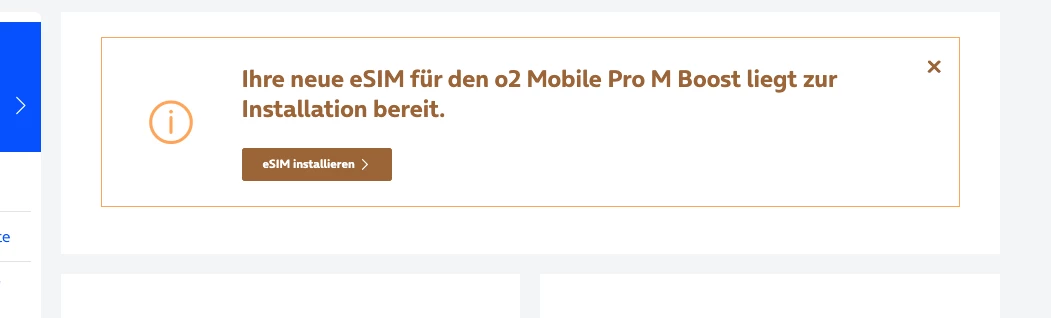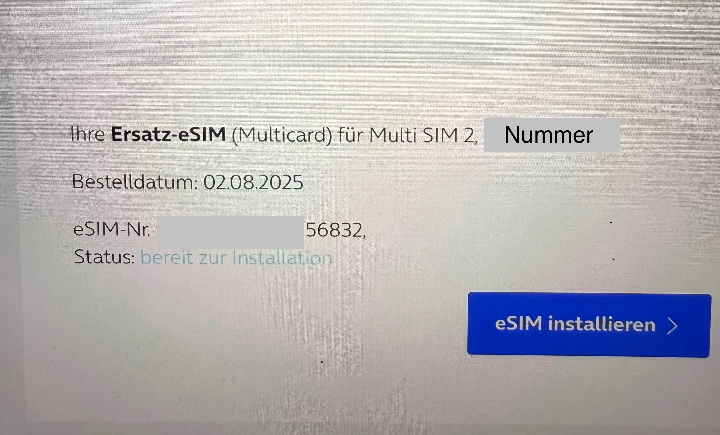 In meinen Bestellungen sehe ich ein zur Installation bereites eSIM Profil welches O2 mir am 02.08 für die deaktivierte MultiSIM 2 erstellt hat.