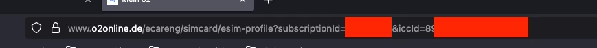 Wenn ihr auf den Button (hier eSIM installieren) klickt, bekommt ihr vermutlich auch eine Fehlermeldung. ABER oben in der Adresszeile steht am Ende die Subscription-ID (das ist eure Vertrags-ID) und danach die ICCID. Das ist die SIM-Kartennummer.