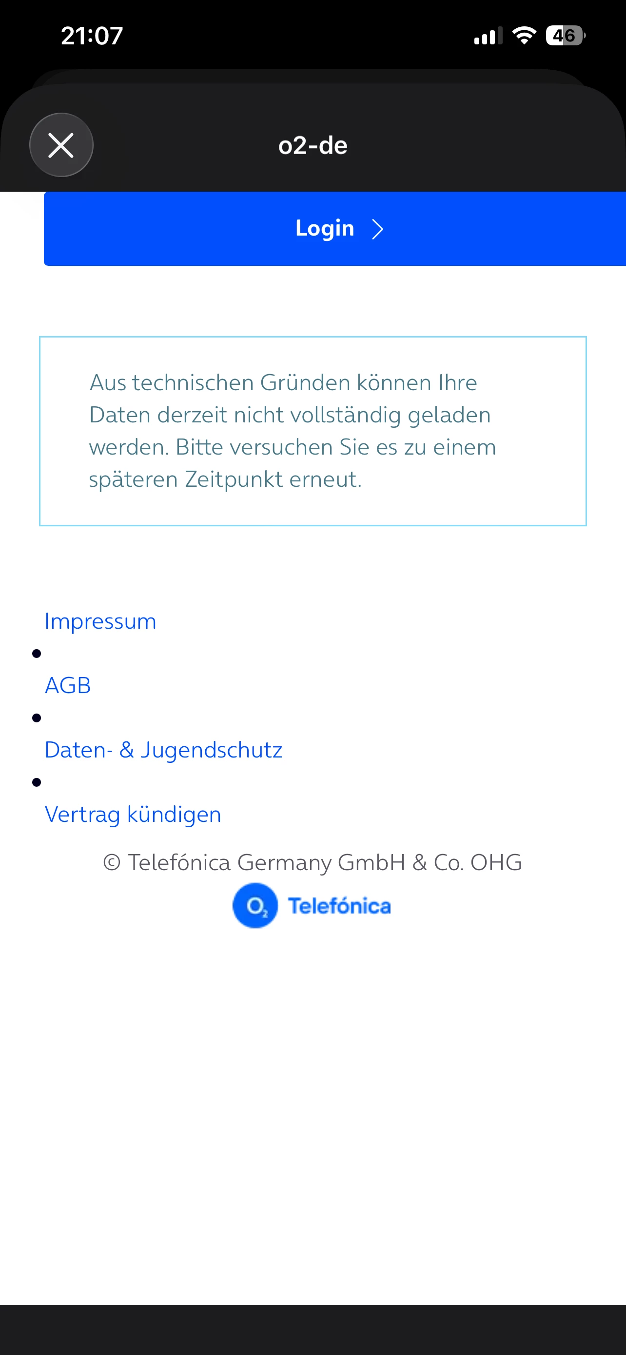 es gibt hier offensichtlich ein problem gibt, für das o2 keine lösung findet.
