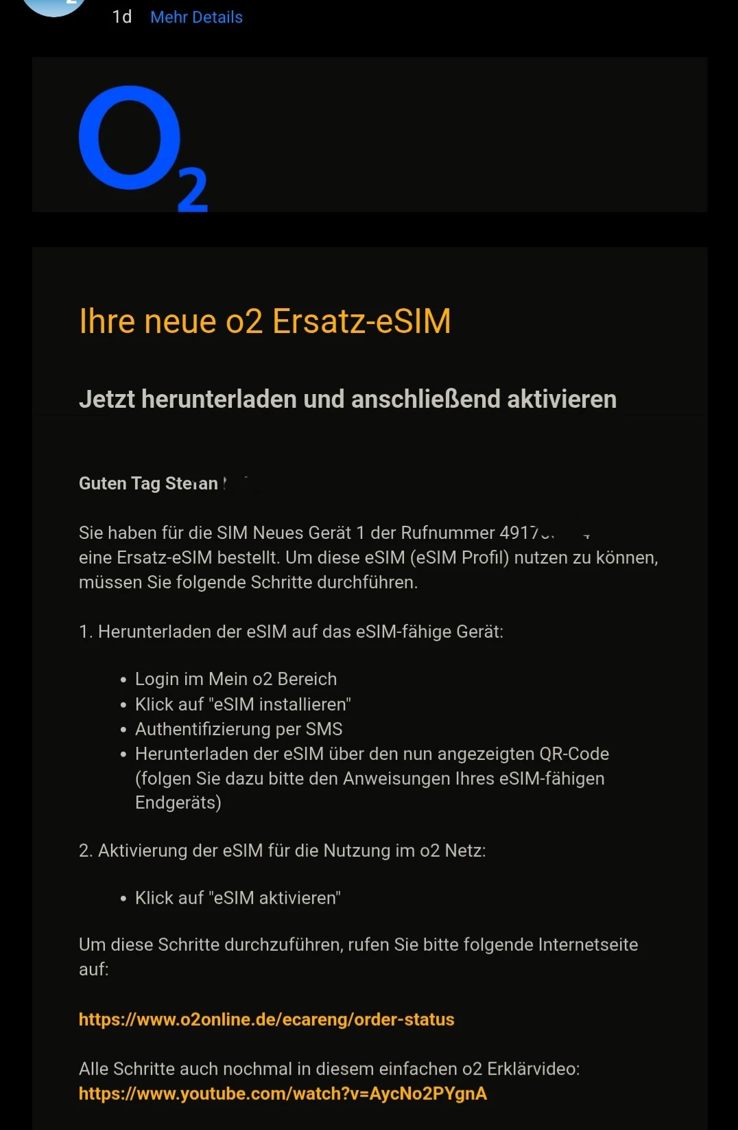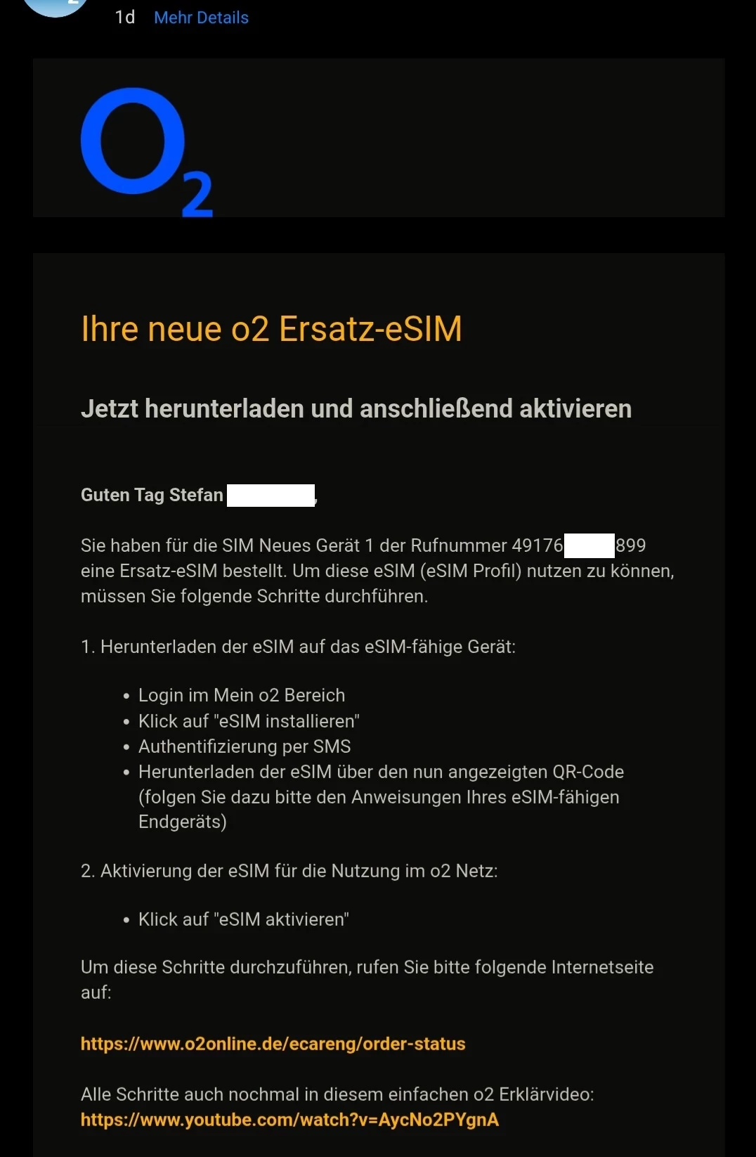 Ja weil ich habe die Nummer samt Handy verloren hatte mir ein anderes Handy geholt und die Nummer hatte ich bestellt als Ersatzkkarte nur als Esim nun hab ich das problem ich will sie installieren aber seht ja geht nicht