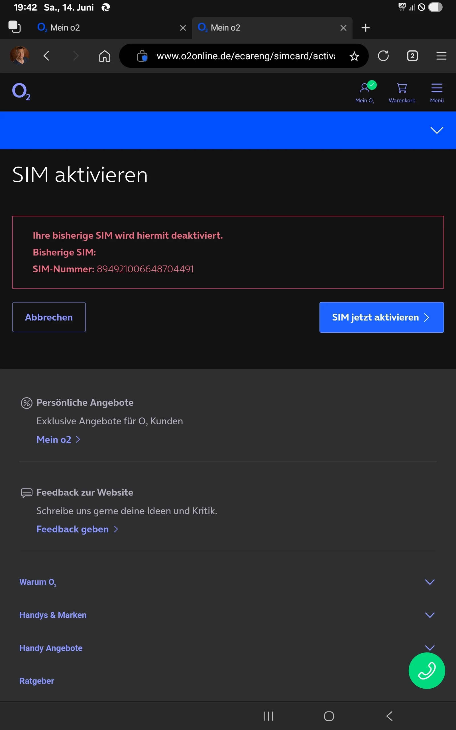 5. Es folgt erneut eine Zusammenfassung mit Tablet, Rufnummer, alter und neuer SIM-Nummer – ich bestätige mit „SIM jetzt aktivieren“.