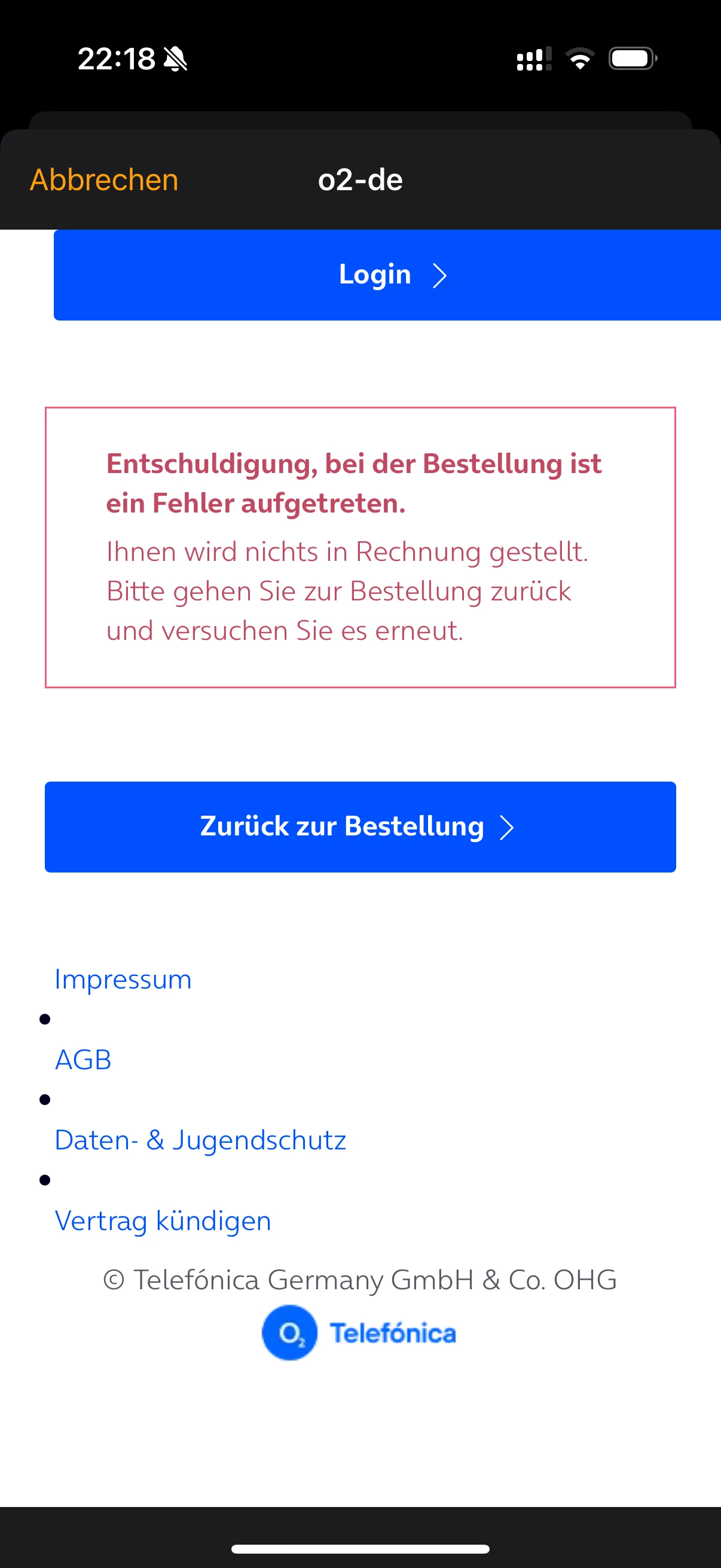 6. Fehlermeldung: Entschuldigung, bei der Bestellung ist ein Fehler aufgetreten. Ihnen wird nichts in Rechnung gestellt. Bitte gehen Sie zur Bestellung zurück und versuchen Sie es erneut. (siehe Screenshot)