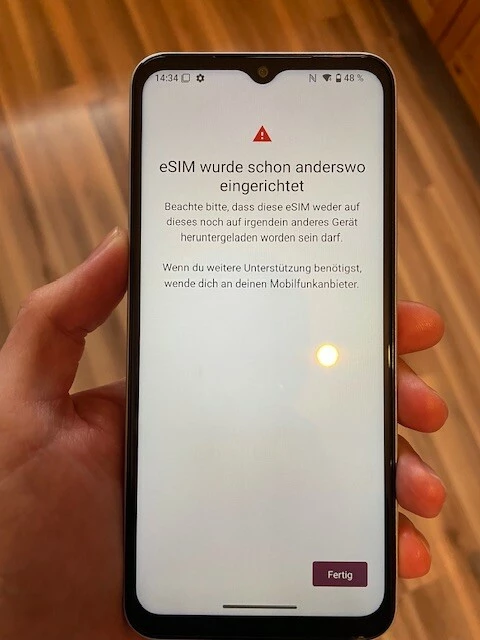 Ich habe mehrere Stunden alleine und mit dem technischen Support von o2 daran gearbeitet eine eSIM auf dem T Phone 3 einzurichten. Es kam immer die gleiche Fehlermeldung. Hier die Meldungen abfotografiert: