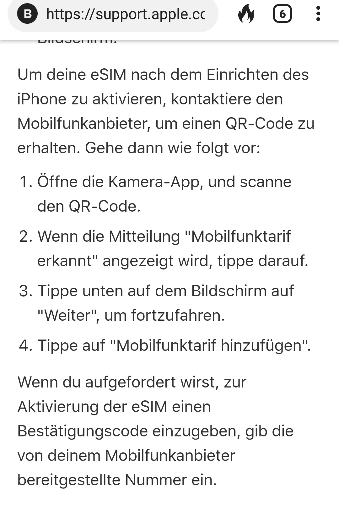 Ich habe ein iPhone 11 und habe eine esim beantragt. Nun kam ein Brief mit einem qr code. Diesen kann ich aber nicht scannen bzw. öffnet sich nichts.