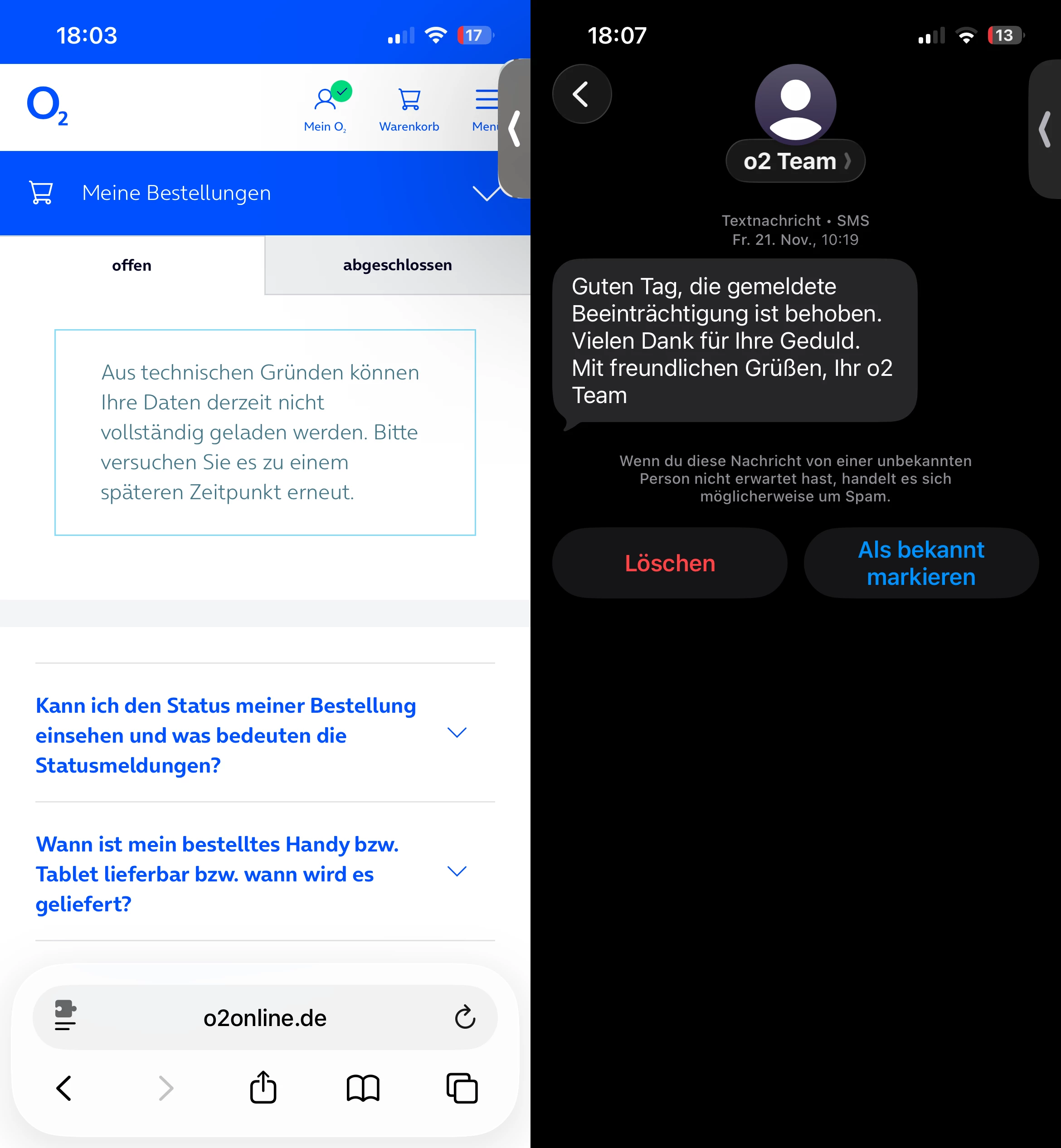 Am 21 November 2025 wurde mir per sms mitgeteilt dass mein Problem/die Störungen behoben sei. Leider kann ich dies nicht absolut bestätigen, da mir seitdem unter “Bestellungen” unter “offen“ sowie "abgeschlossen" folgende Fehlermeldung angezeigt wird: