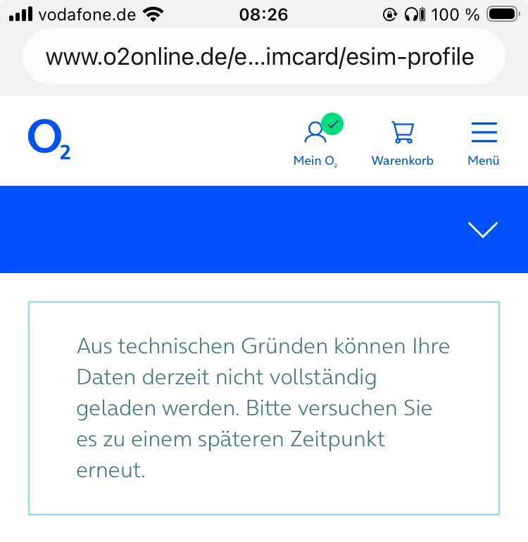 Wenn ich eSIM installieren auswähle springe ich im Webbrowser (mehrere verschiedene Browser ausprobiert) entweder zurück in die Vertragsübersicht oder es erscheint die Meldung: “Aus technischen Gründen können ihre Daten derzeit nicht vollständig geladen werden. Bitte versuchen sie es zu einem späteren Zeitpunkt erneut.”