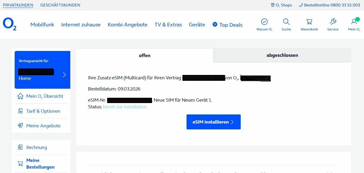 Moin, ich habe am 09.03. erfolgreich eine eSIM als MultiCard zu meinem bestehenden Vertrag bestellt. Bestellung wurde schnell bearbeitet und eMail mit Link zur Aktivierung bzw. Installation der eSIM in MeinO2 wurde zur Verfügung gestellt. Ich habe (unter Bestellungen/Ordern) Links eSIM installieren.