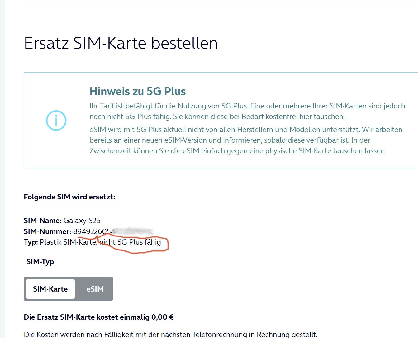 trotz aller bisherigen Bemühungen ist es mir leider weiterhin nicht möglich, eine kostenlose, 5G-Plus-fähige Ersatz-SIM zu bestellen.