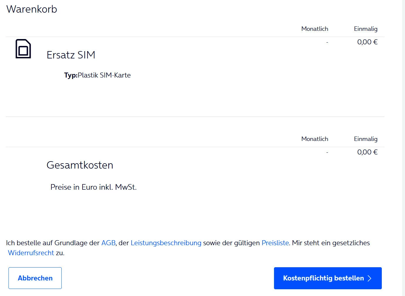 Ich habe erstmals am 27.01.2026 auf dem regulären Weg eine Ersatz-SIM bestellt, da ich den Verdacht hatte, dass meine alte SIM-Karte (über 15 Jahre alt) technisch nicht mehr in der Lage ist, 5G vollständig zu unterstützen. Die Kosten in Höhe von 29,99 € habe ich dabei schweren Herzens in Kauf genommen.