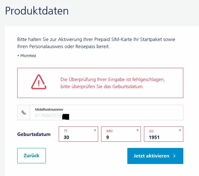 Kann sim nicht aktivieren. Falsches Geburtsdatum