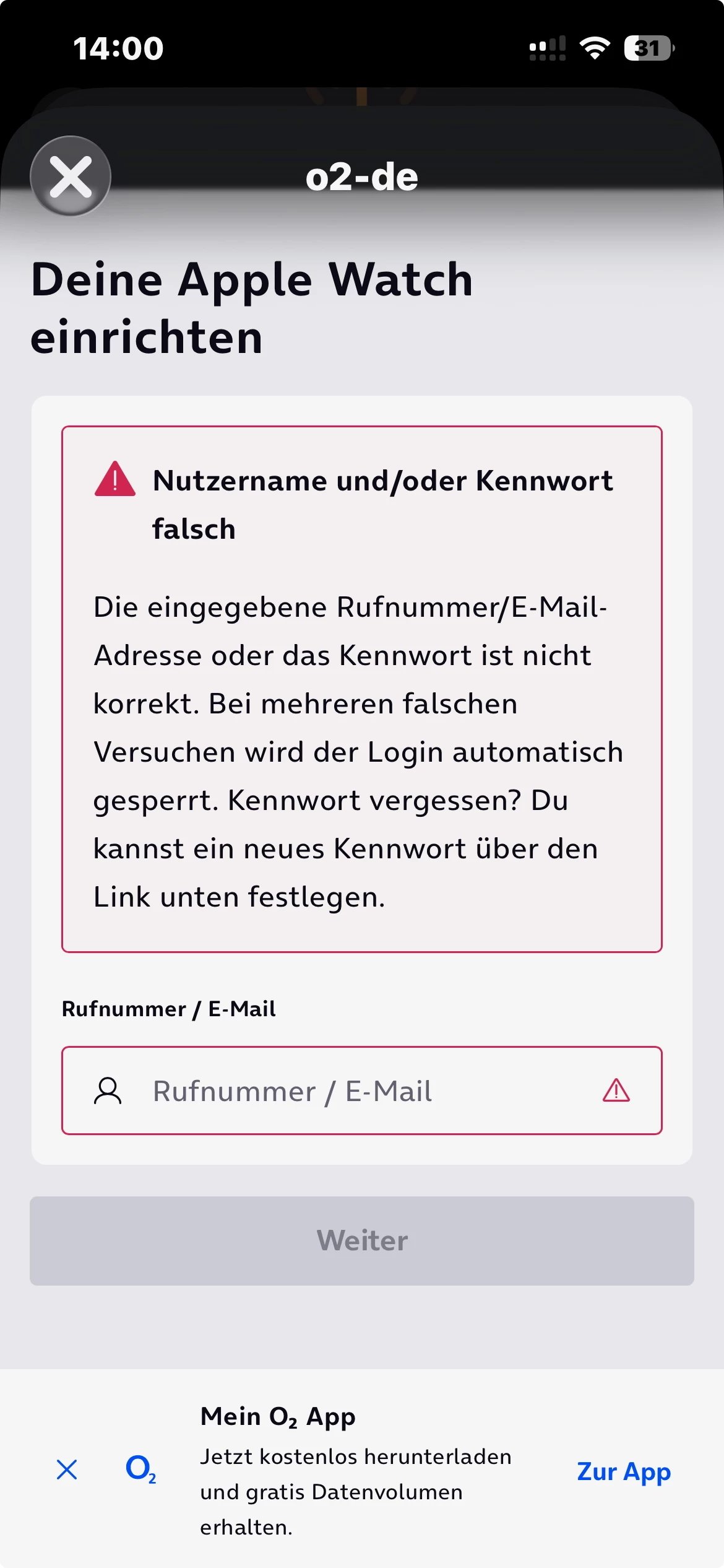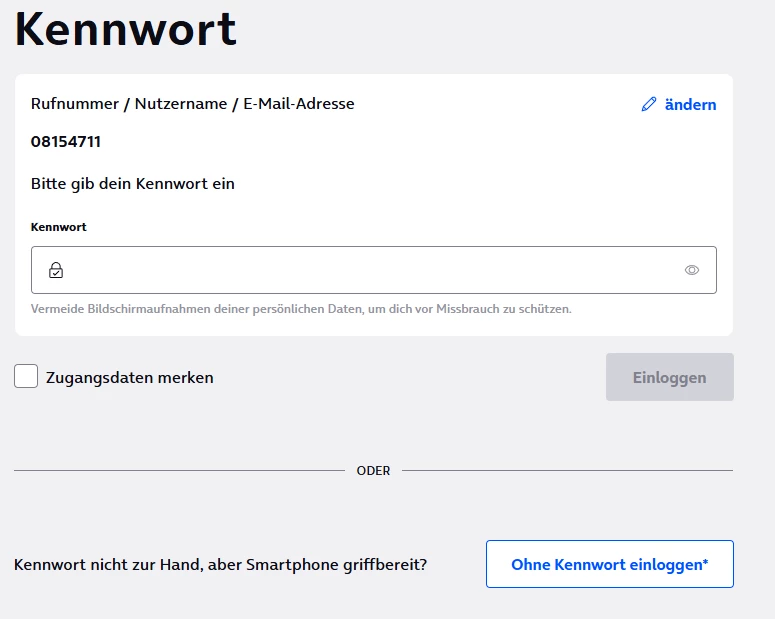 • Der Login funktioniert auch nicht, weder mit einer 0 noch mit der 49 am Anfang der Telefonnummer, FM: Nutzername und/oder Kennwort falsch