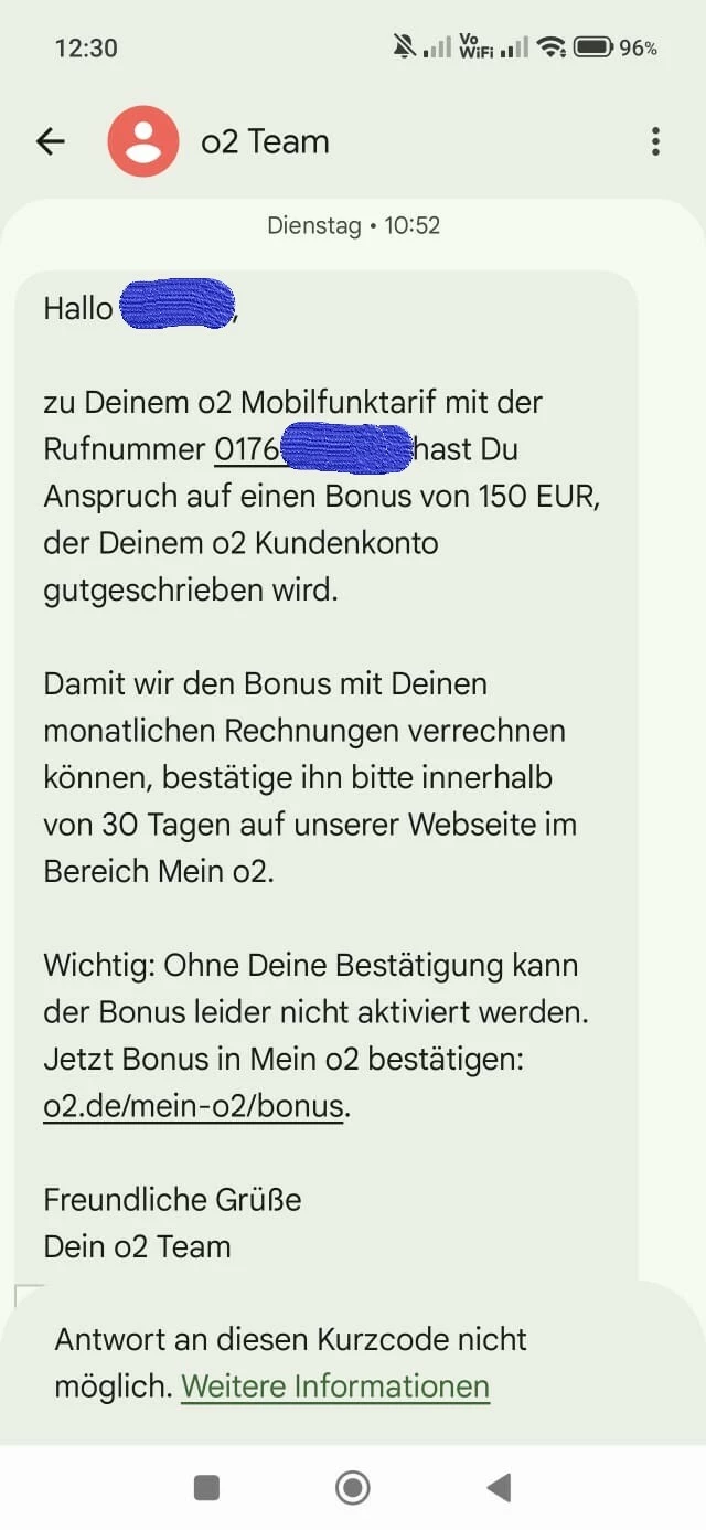 zu Deinem neuen o2 Mobilfunktarif mit der Rufnummer xxxxxxxxx hast Du Anspruch auf einen Bonus in Höhe von 150 EUR.