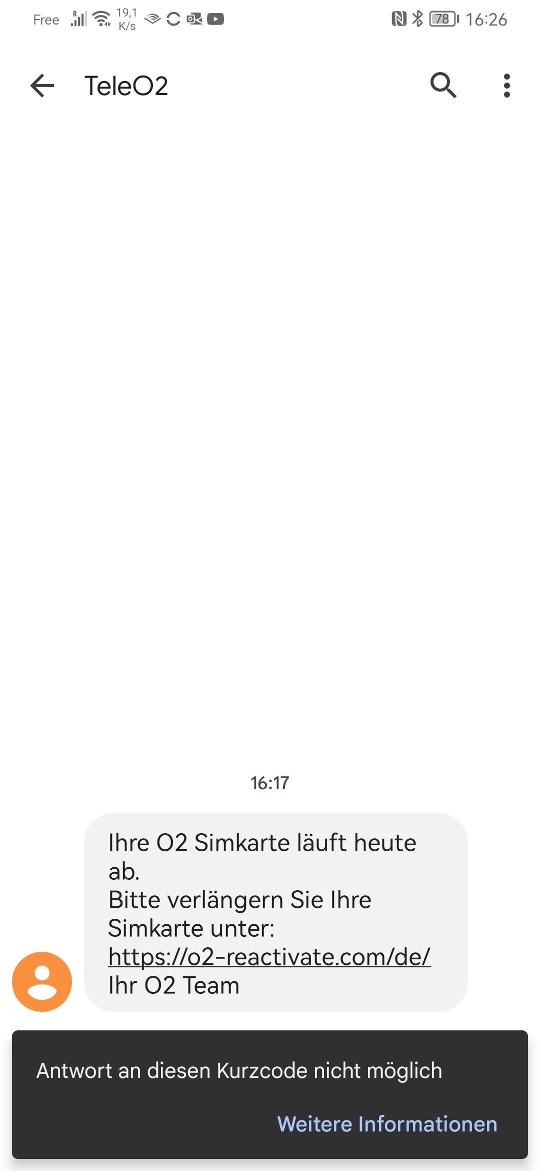 danke für deinen Hinweis. Dabei handelt es sich um keine SMS von uns. Wohin auch immer der Link am Ende führt, bitte diesen nicht nutzen. Sofern das allerdings bereits passiert ist und dort die Zugangsdaten vom Mein o2 Bereich genutzt wurden, diese bitte direkt wieder ändern.
