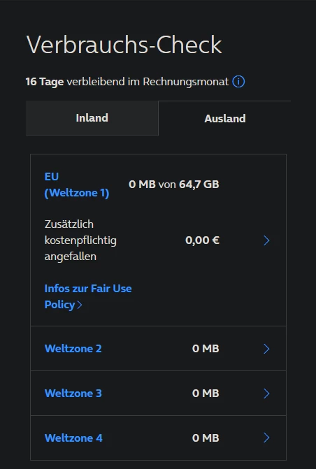 Im ersten Screenshot steht schon mal 0MB, obwohl in Deutschland Daten verbraucht wurden (mit allen Karten), außerdem 3,3 im EU Ausland!