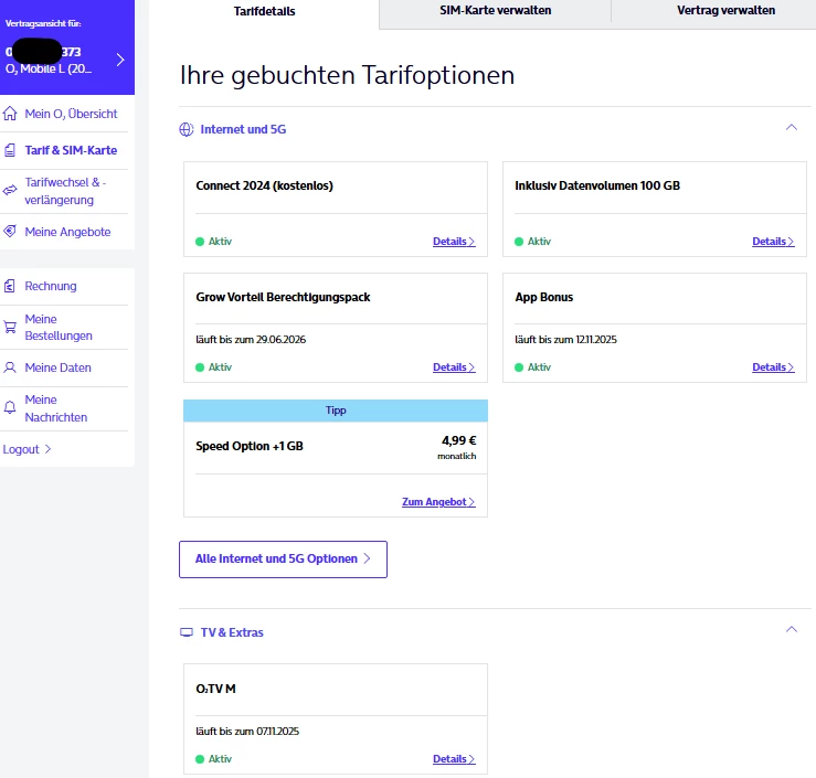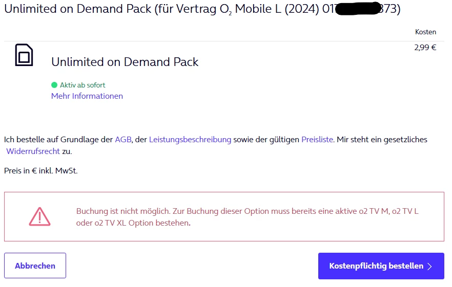 Jetzt habe ich in der Nachrichtenbox unter Mein O2 noch Werbung für eine Unlimited On Demand Option für 2,99 EUR gefunden (https://www.o2online.de/ebuy/?pack=UNLIMITED_DATA_OD). Beim Versuch diese Option zu buchen bekomme ich immer die Fehlermeldung “Buchung ist nicht möglich. Zur Buchung dieser Option muss bereits eine aktive o2 TV M / L / XL Option besehen.”